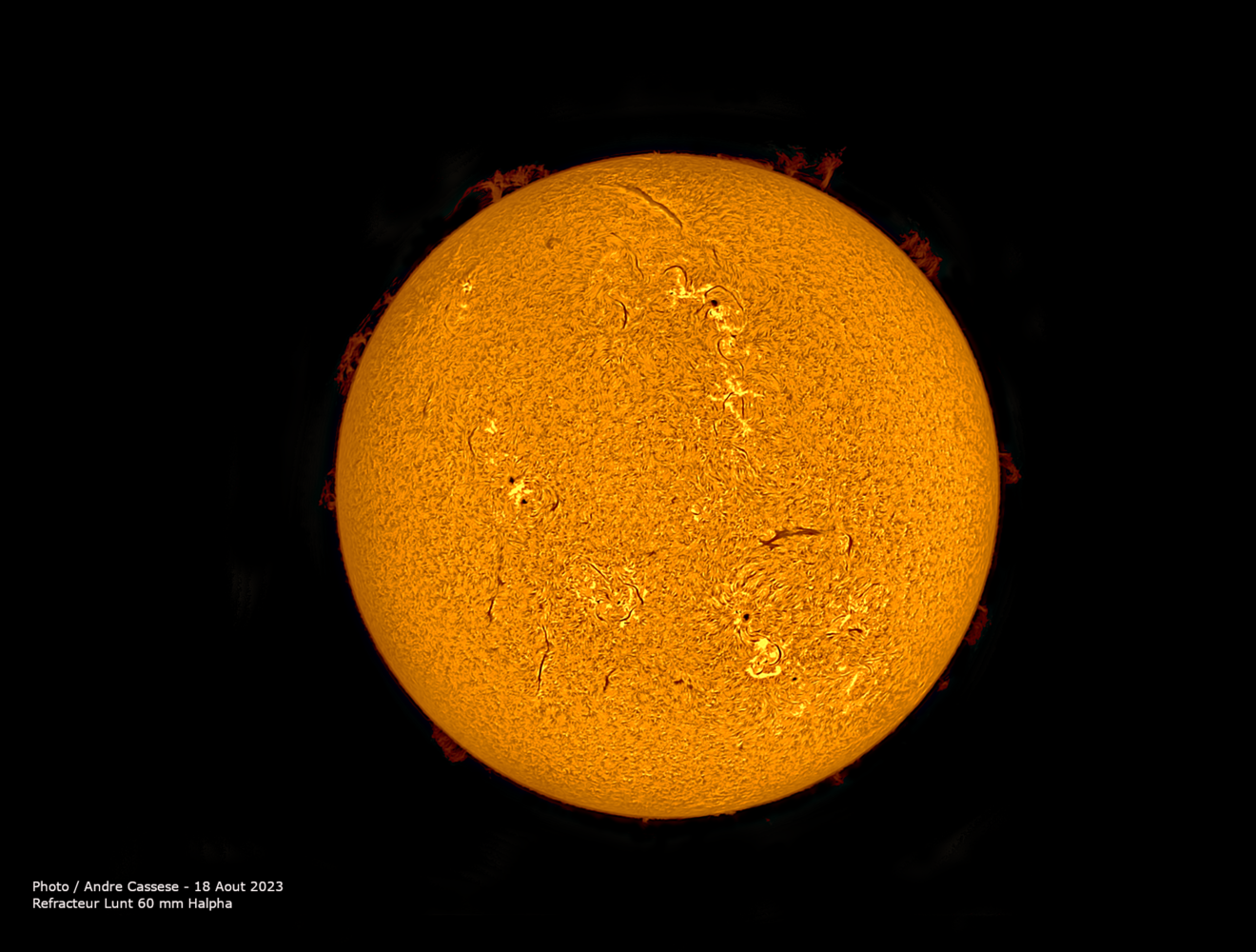 ce 24 Juin 2023, des grosses protubérances et jolies surfaces actives Lunette 150 mm Halpha étalon PST prototype de 2004 , barlow 2x et camera Apollo iMX 429-