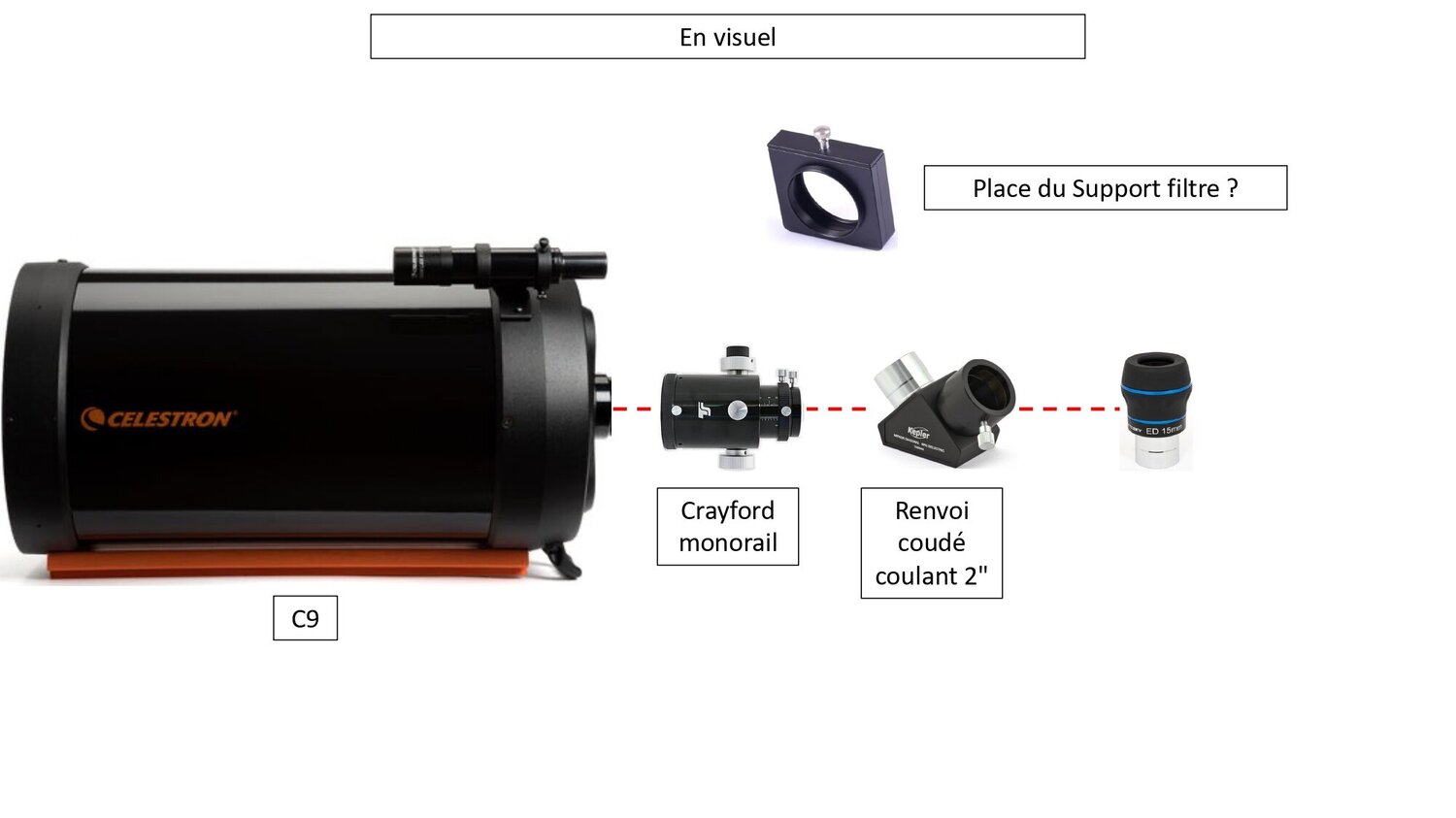 Bonjour Tout d'abord, je vous à tous une excellente année. Ensuite, je m'interroge sur l'emplacement d'un support filtre à tiroir sur ma chaine optique de mon C9 en visuel et pourquoi pas en astrophoto avec un APN. Je ne sais pas où le placer. J'ai un Crayford monorail, un renvoi coudé en coulant 2", un adaptateur photo, une bague T2. J'ai beaucoup de mal à placer un support filtre. Je vous ai fais 2 schémas en JPG de ma chaine optique en visuel et avec mon APN. Vous pouvez faire des modifications sur les 2 pièces jointes. En vous remerciant par avance. Johann