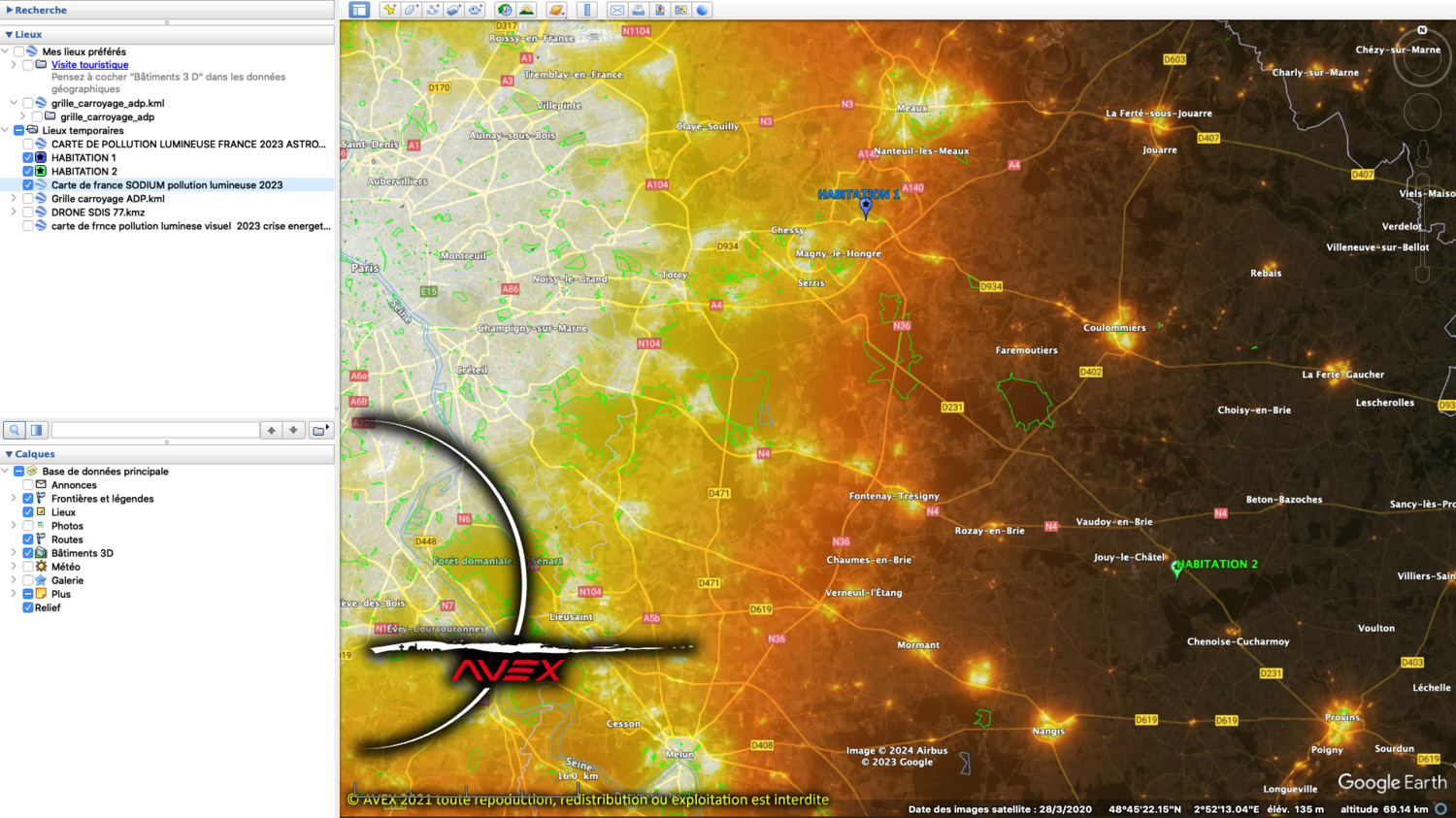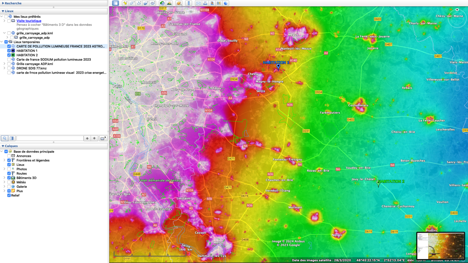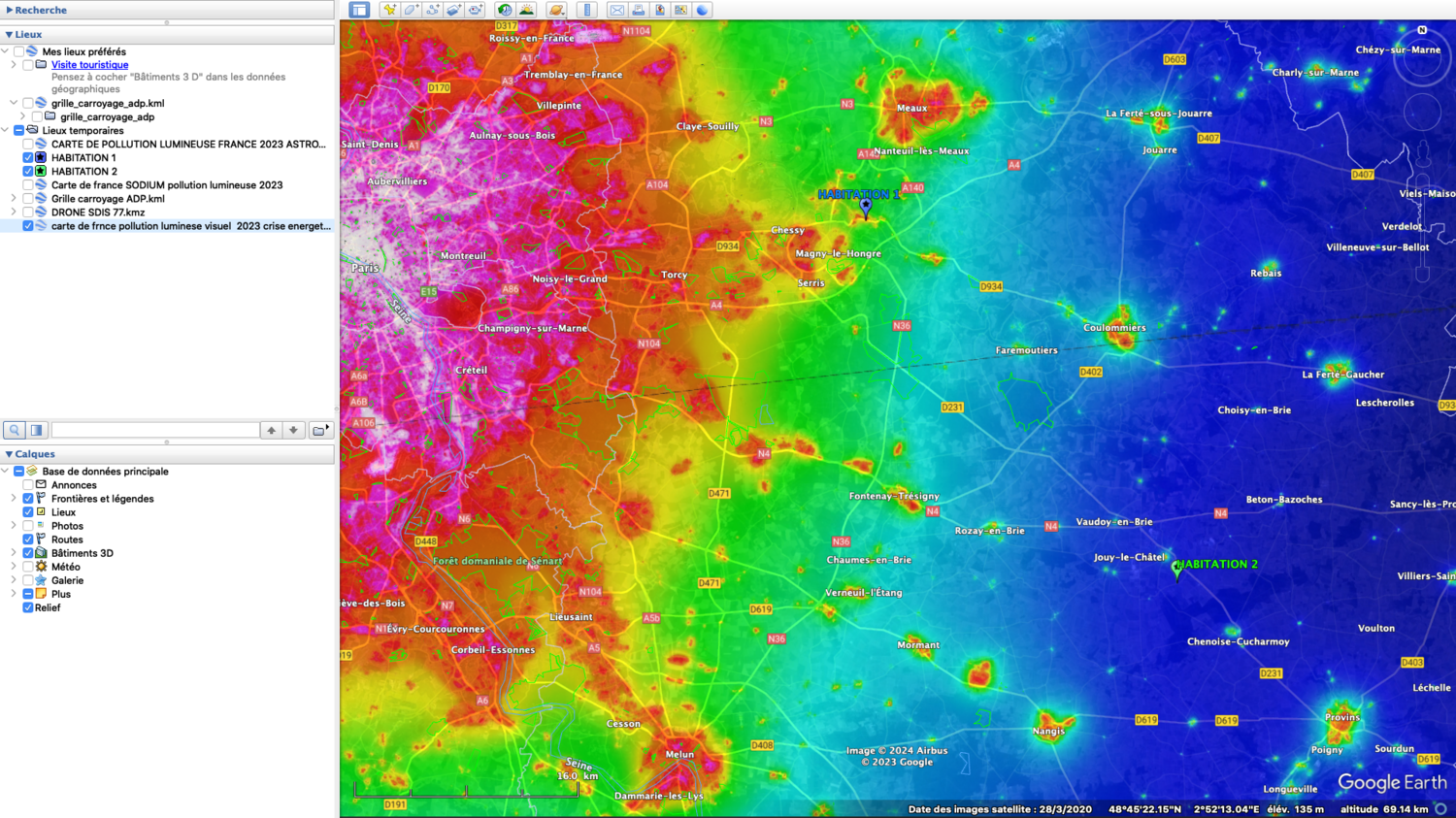 Bonjour à tous. Je reviens vers vous tous pour un sujet auquel je n'ai pas trouvé mes réponses. Certes, j'avais déjà lancé ce sujet (j'avais discuté avec quelques uns d'entre vous mais nous n'avons pas pu aller dans les détails) mais la conversation a dérivé sur du matériel et de l'optique. Je suis possesseur d'un C9.25 en Ile de France. Je vous ai mis en pièce jointe le lieu approximatif de mes 2 lieux d'habitation suivant la pollution lumineuse. Après de longues heures de lecture des différents spots sur le sujet des filtres, mon attention s'est portée sur ces filtres suivants, qui je pense me seront utiles: Filtre lunaire: Polarisant variable Kepler (lien) Filtre Skyglow: Moon Skyglow Baader (lien) Skyglow Optolong (lien) Filtre UHC: UHC Optolong (lien) Filtre OIII: OIII Super G Baader (lien) OIII Optolong (lien) Filtre H-béta: H-béta Optolong (lien) Filtre Optolong L-Pro (lien) Certains seront doublons probablement et d'autres inutiles. Mais selon mon lieu géographique, je suis perdus. J'oubliais, c'est essentiellement pour de l'observation et aussi faire mes premières photos sur reflex non défiltré (Pentax K20D). Merci à vous. Johann