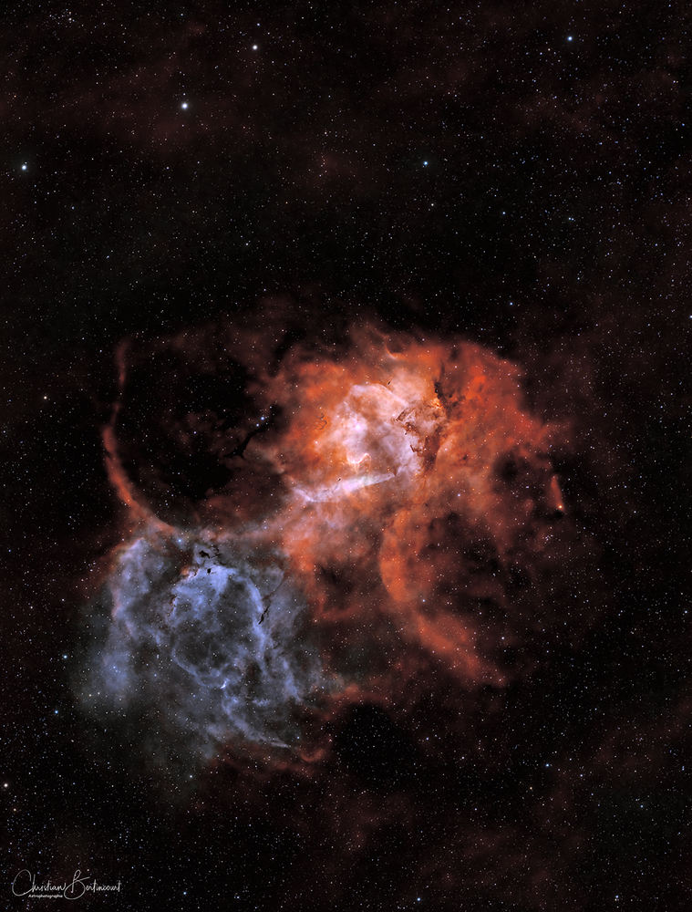 Je vous présente aujourd'hui toutes ces merveilles du ciel en une seule image - Sharpless 157 (Sh2-157), également connue sous le nom de la nébuleuse de la Pince de Homard, est une nébuleuse à émission située dans la constellation de Cassiopée. Elle est distante d’environ 11500 années-lumière de la Terre. Son diamètre et d’environ 212 années-lumière. Vu de la Terre, la nébuleuse a le double de la dimension de la Lune. - M52 (ou NGC 7654) est un amas ouvert, son diamètre est d'environ 19 années-lumière et son âge est estimé à 35 millions d'années - NGC 7635 (la nébuleuse de la Bulle) est une nébuleuse planétaire. Cette nébuleuse résulte de l’expulsion de matière provoquée par la forte pression de radiation de l’étoile de magnitude 8 qui l'englobe. Elle mesure environ 8 années-lumière de diamètre. - La nébuleuse NGC7538 est une nébuleuse à émission brillante dans la constellation de Céphée. Elle est distante de 9100 années-lumière de la Terre. Sa taille est 300 fois celle de notre système solaire ! Elle abrite la plus grande protoétoile découverte. - NGC 7510 est un amas ouvert situé à environ 11 400 années-lumière de la Terre également dans la constellation de Céphée. : Antlia ALP-T Ha & OIII 5nm, Antlia SII, Antlia Ultra RVB : 140x300" HA&OIII - 68x300" SII - 12x300" RVB : ZWO Asiair Pro : Askar FRA600 f/3.9 : ZWO ASI2600Mc Pro : iOptron GEM45 : ZWO ASI290MM Mini & guide scope Omegon 50mm : Siril - PixInsight - Affinity - Paint Shop Pro : env Lyon : Bortle 5.8 : 19-20-23-24-25 septembre 2023 La version full ici https://flic.kr/p/2p5eeXC