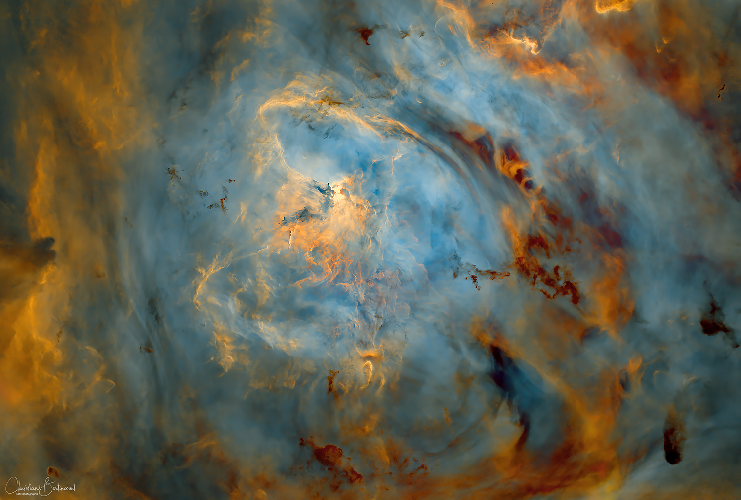M8 Je vous présente aujourd'hui une version "starless" au cœur de la nébuleuse de la Lagune. Nébuleuse diffuse située dans le Sagittaire, il s'agit d'un nuage interstellaire où naissent de nombreuses étoiles jeunes. Elle est visible à l'œil nu sous de très bonnes conditions. Immense nuage d'hydrogène et de poussières éclairé par l'étoile 9 Sagittarii. C'est un système binaire d'étoiles constitué de deux géantes bleues dont les luminosités sont respectivement égales à 316 000 et 562 000 fois celle du Soleil Sa distance à la Terre est d'environ 4 100 années-lumière. Données brutes issues du site "Telescope Live" et prises avec un télescope de 61 cm (CDK24) dans la vallée du Rio Hurtado, au Chili. 67x300s en SHO, le 06 avril 2023. Pré traitement Siril, traitement Pixinsight, retouches Photoshop La version full ici https://flic.kr/p/2pFJdGo