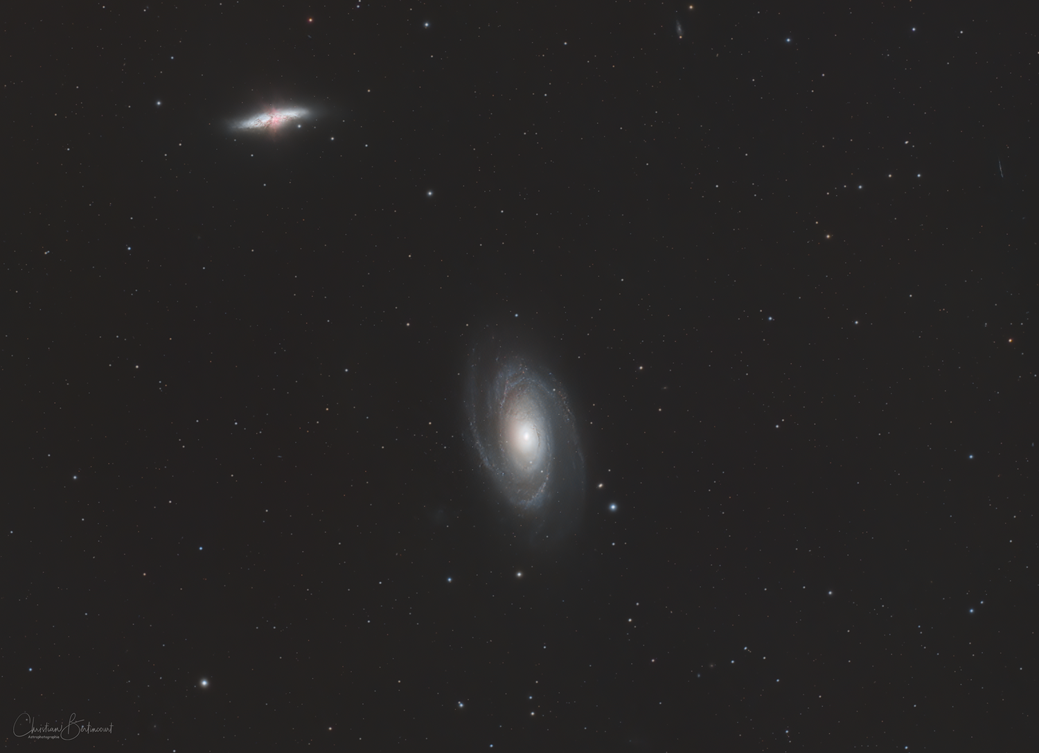 Dans la Grande Ourse, le duo formé par les galaxies M81 et M82 est remarquable. Les deux objets sont proches, ce qui permet de les observer ensemble et d’apprécier leurs différences d’aspect. M81 est une galaxie spirale vue de trois quarts avec un noyau marqué et quasi ponctuel. M82 est une galaxie irrégulière vue par la tranche, plus petite mais contrastée et dont la forme rappelle celle d’un cigare. Les galaxies M81 et M82 situées à environ 12 millions d’années-lumière, comptent donc parmi les galaxies les plus proches de la nôtre. Crop de l'image initiale. : Filtre Triband RVB Ultra Antlia : 55x300" : ZWO Asiair Plus : Askar FRA600 f/3.9 : ZWO ASI6200Mc Pro à -15° : iOptron GEM45 : ZWO ASI290MM Mini & guide scope Omegon 50mm : Siril - PixInsight - Photoshop : Env Lyon : Bortle 5.9 : 20 avril 2024