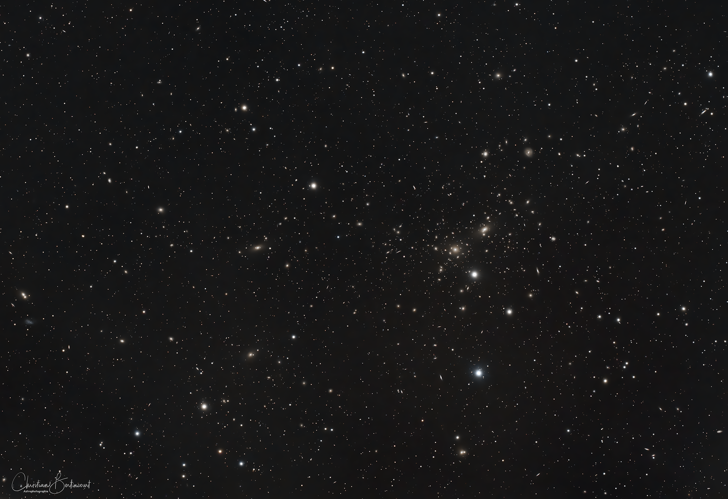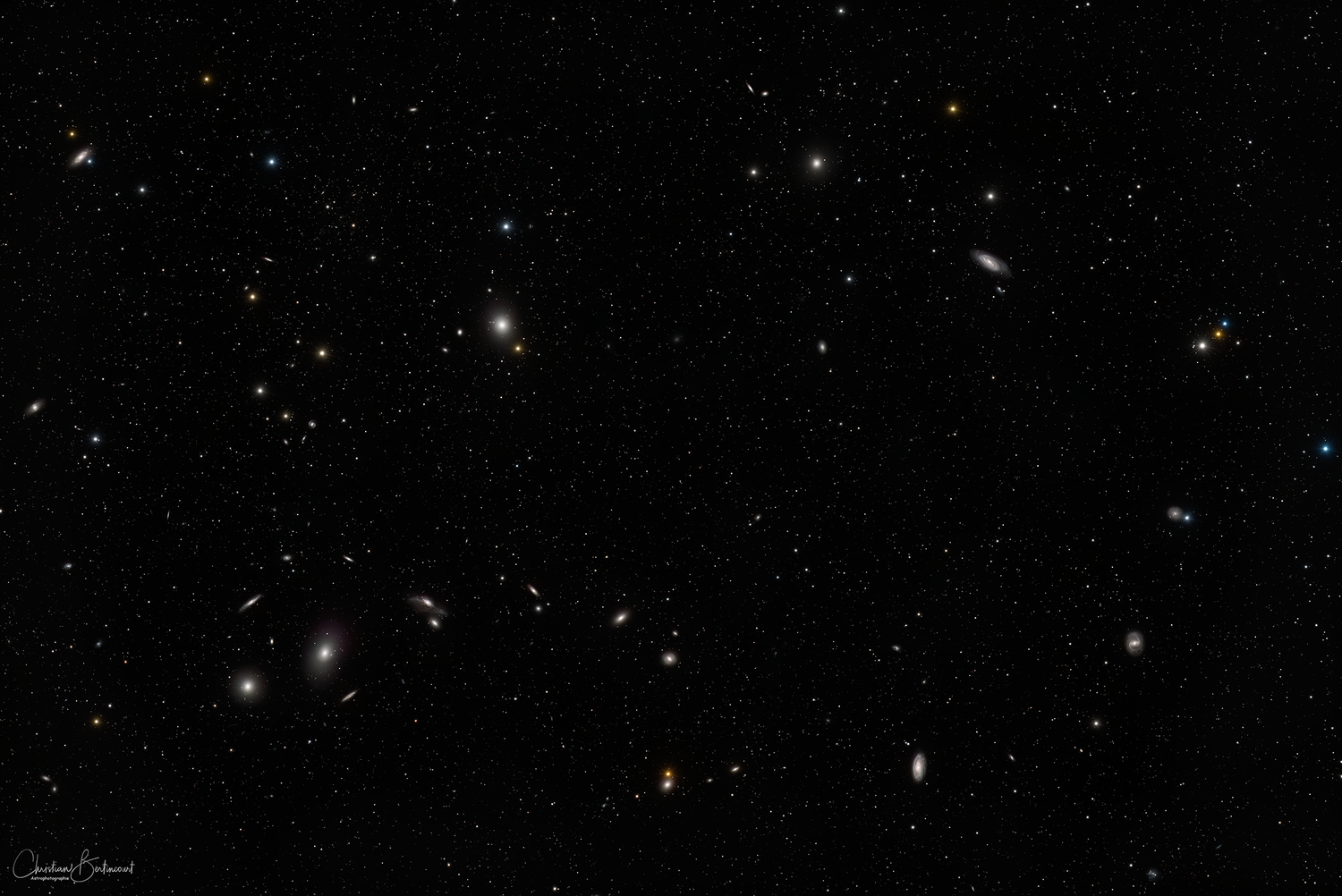 Chevelure de Bérénice Le groupe de NGC 4889 comprend au moins 18 galaxies situées dans la constellation de la Chevelure de Bérénice. Egalement connue comme Caldwell 35, c'est une galaxie elliptique super-géante, la plus brillante de l'amas de la Chevelure de Bérénice. Elle a une magnitude de + 11,4. Elle est située près de l'étoile de classe G, β Comae Berenices, la galaxie NGC 4874 et le pôle Nord galactique. Elle se situe à environ 308 millions d'années-lumière. Elle possède un trou noir supermassif en son centre qui est l'un des plus lourd connus avec 21 milliards de masse solaire. : Filtre Triband RVB Ultra Antlia : 60x300" : ZWO Asiair Plus : Askar FRA600 f/3.9 : ZWO ASI6200Mc Pro à -15° : iOptron GEM45 : ZWO ASI290MM Mini & guide scope Omegon 50mm : Siril - PixInsight - Photoshop : Env Lyon : Bortle 5.9 : 08/05/2024 La version full https://flic.kr/p/2pQ6AKP