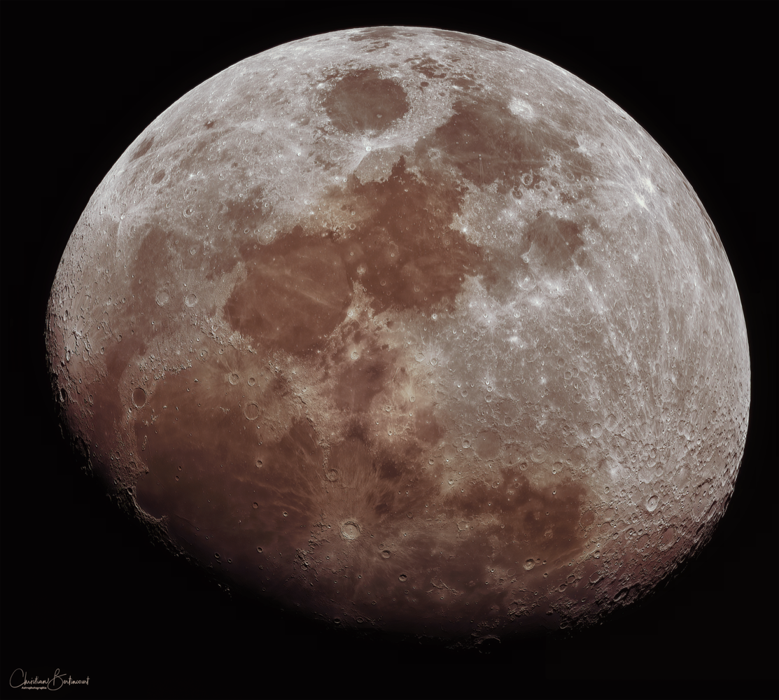 Traitement d'une Lune qui était restée sur mon disque... Lunette APO de 80mm, focale de 1240m, il m'aura fallu 11 vidéos avec ma camera Zwo 2600MC pour couvrir les 84% de cette phase lunaire de 10,82 jours. Assemblage des 11 plans avec Imerge. Traitement et Stack sous AS3 puis ondelettes RegiStax, retouches PSP. J'espère qu'elle vous plaira 😉