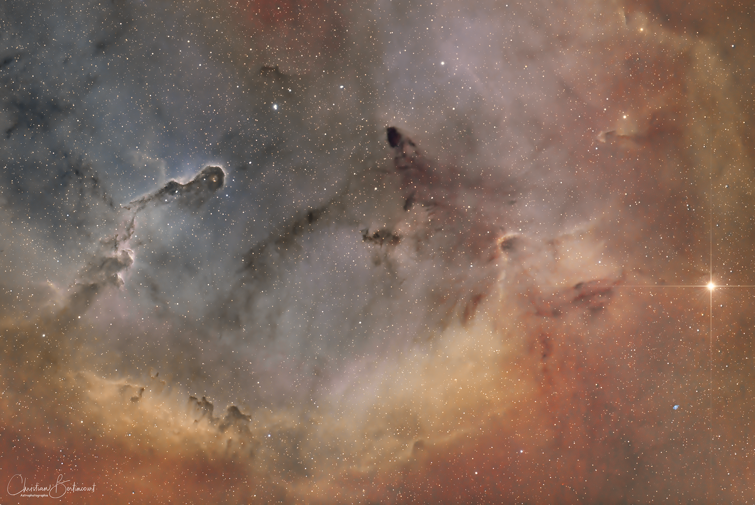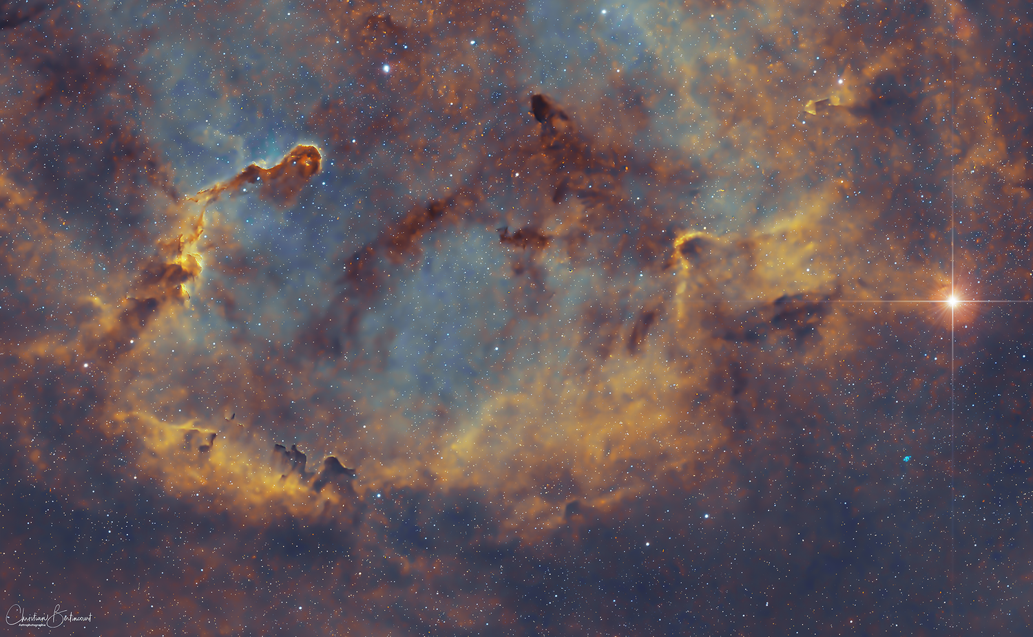 LBN310 Situées dans le Cygne, ces parcelles allongées de nébuleuses en émission sont extrêmement faibles. Elles appartiennent à un immense complexe de nébuleuses qui comprend également la région de la nébuleuse γ Cygni . L'apparence incurvée et la structure filamenteuse de ces nébuleuses impliquent qu'elles ont été formées par une supernova qui aurait pu exploser. : Filtre Antlia ALP-T 5nm :34x300" mosaïque de 2 panneaux : ZWO Asiair Plus : Askar FRA600 f/3.9 : ZWO ASI6200Mc Pro à -15° : iOptron GEM45 : ZWO ASI290MM Mini & guide scope Omegon 50mm : Siril - PixInsight - Photoshop : Env Lyon : Bortle 5.9 : 12 et 13/06/2024 La version full https://flic.kr/p/2pXidKY