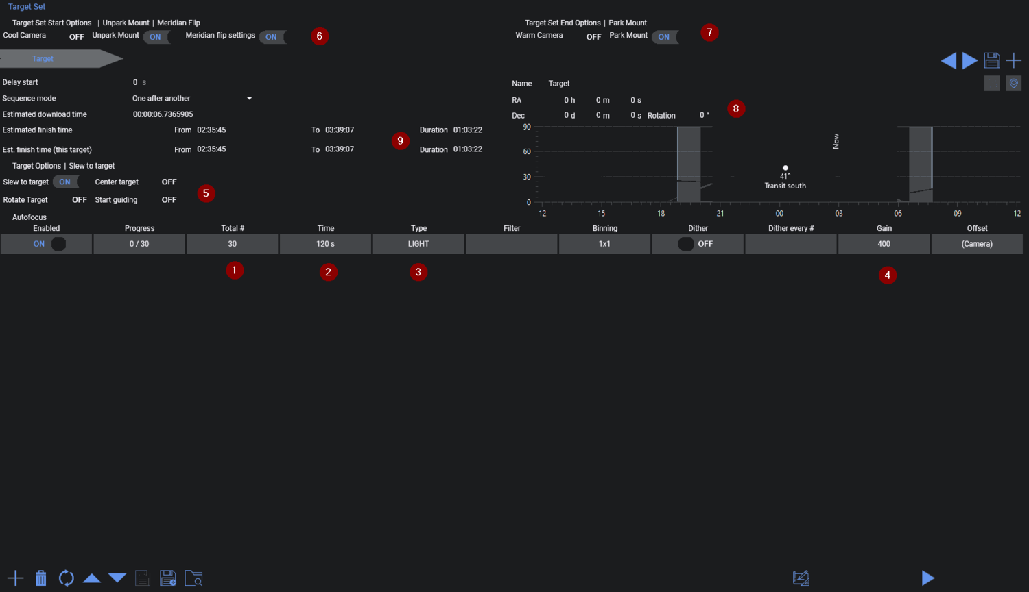 Bonjour, J'ai pas l'habitude du séquenceur simple mais il montre (tout comme le séquenceur avancé) les coordonnées RA et DEC de chaque cible (en 8 ci dessous), est ce que les coordonnées étaient différentes sur chacun des 4 panneaux ? En fait une mosaïque est traitée comme 4 cibles distinctes.