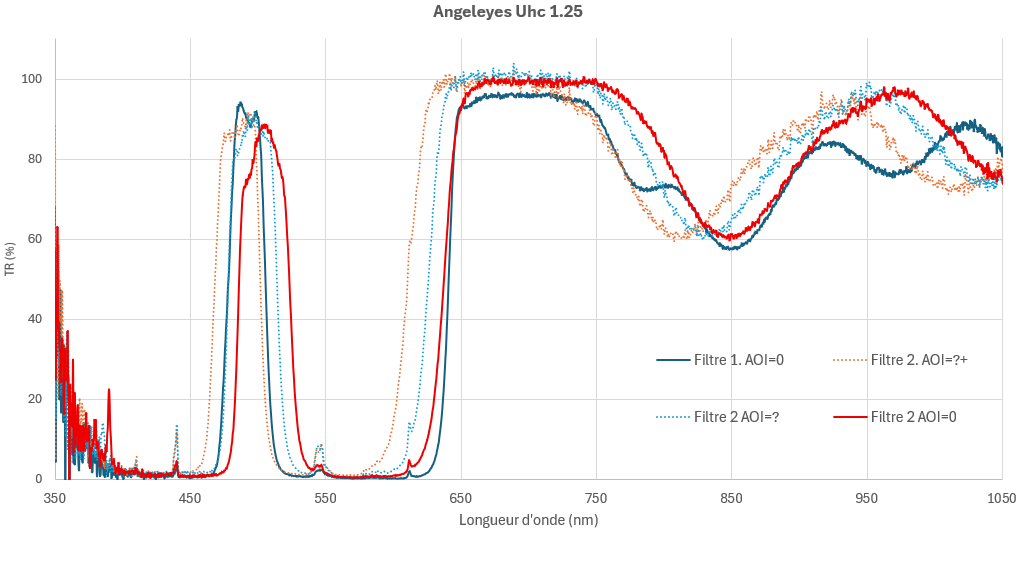 Bonjour, J'ai vu sur le forum un post partageant des fichiers 3D pour mettre des filtres UHC 1.25" à la sortie de jumelles EX action 10x50... Possédant les dites jumelles et une imprimante 3D, je me suis empressé d'imprimer les accessoires proposés. Sauf que j'ai pas de paire d'UHC. Ni même 1 seul d'ailleurs. En personne raisonnable, plutôt que de mettre 200€ pour avoir 2 bons filtres je me suis posé la question suivante : "Que valent les UHC les plus cheap que je puisse trouver ?" D'autant qu'aux jumelles, les UHC sont probablement trop... sombres. A quoi bon payer 200€ pour rien y voir ? Mon choix s'est posé sur ceux-ci à ~13€/pcs : https://fr.aliexpress.com/item/33019063133.html?spm=a2g0o.order_list.order_list_main.5.1d395e5bnbF0ed&gatewayAdapt=glo2fra Il est pas trop beau ? Aucun logo/marque sur la boite ou le filtre. Juste "UHC Filter". Hum, intéressant, sans doute des timides. Ayant eu accès à un spectromètre quelques minutes le mois dernier, j'ai mesuré la transmission des filtres. Malheureusement, j'ai pas eu le temps de les fixer parfaitement à la normale du faisceau ni assurer un bon SnR pendant la mesure. J'ai fait des mesures à la 'shlag' comme diraient certains de mes collègues. Moi je préfère dire "des mesures indicatives". Les barres d'erreur... il vaut mieux ne pas en parler pour cette fois-ci. Ces courbes ne sont fournies qu'à titre éducatif et ne peuvent pas constituer le fondement de quoi que ce soit. Voici la transmission des "Angeleyes Uhc 1.25". Comme on peut s'en douter, la position exacte des fronts changent selon l'angle avec lequel la lumière entre dans le filtre (l' AOI en english). Cela explique que les bords de champs soient plutôt rouges quand on regarde dedans. J'ai très scientifiquement incliné le filtre à la main pour mesurer à la normale (max 5° d'erreur) et avec 2 AoI quelque part entre 20° et 45°. Vous remarquerez que les filtres 1 & 2 ne sont pas trop les mêmes d'après mes mesures. En voyant ça en écrivant ce post je les ai naturellement plaqués à mes yeux et je me suis baladé dans la maison comme ça... Effectivement, un des 2 est plus lumineux. Vert pétard. L'autre est sombre et moins vert... D'ailleurs, doué que je suis, je ne sais plus qui est No1 et No2. Donc j'ai "le fluo" et "le sombre" maintenant. A la défense du constructeur... je ne me souviens pas d'une telle différence quand je les ai déballés et utilisés avant les mesures. le "sombre" a d'ailleurs des saletés à sa surface. J'ai dû accidentellement toucher le filtre. Peut etre que mon sébum acide l'a abimé ? Dommage. A comparer avec des filtres renommés... Ah ! Et j'ai testé aux jumelles.... Super sombre et pas pratique. J'ai visé la zone de la trifide. Je retenterai l'expérience sur Orion à la limite... Des cibles à me suggérer ? Alk