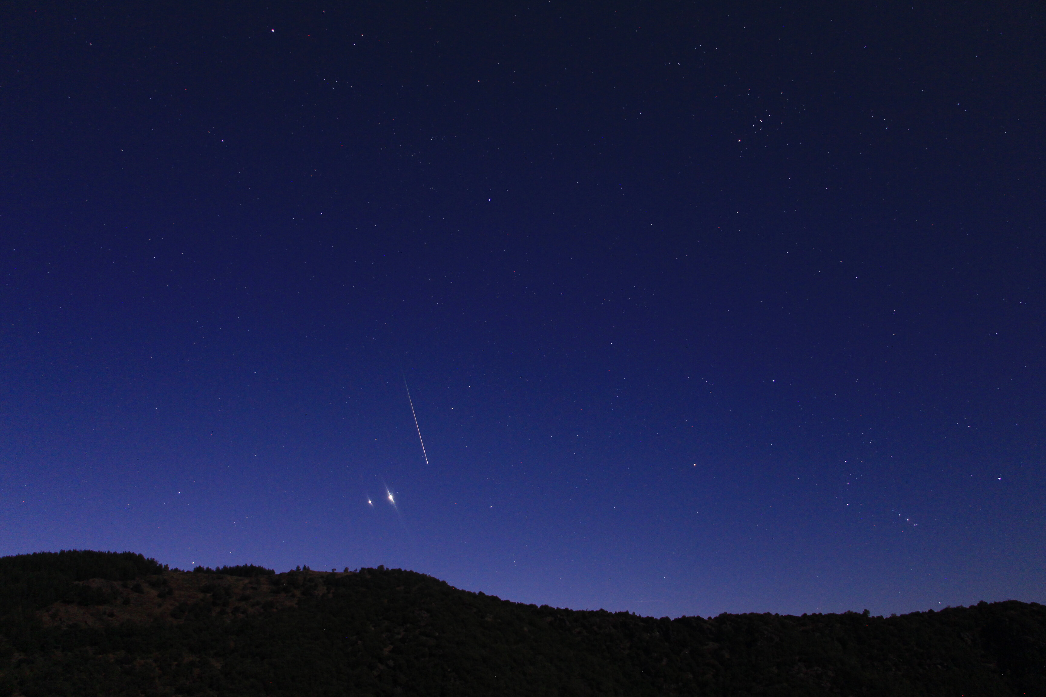 le 13, observation en famille à l'écart des villes, dans le massif du Pilat (Loire) visible dès le crépuscule, magnifique (photo unique, reflex sur trépied, pose 8s, iso800, 35mm):
