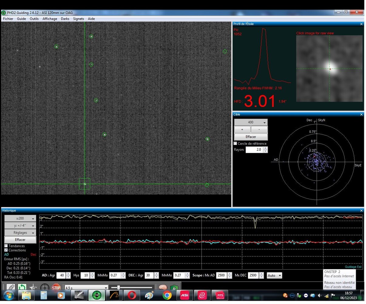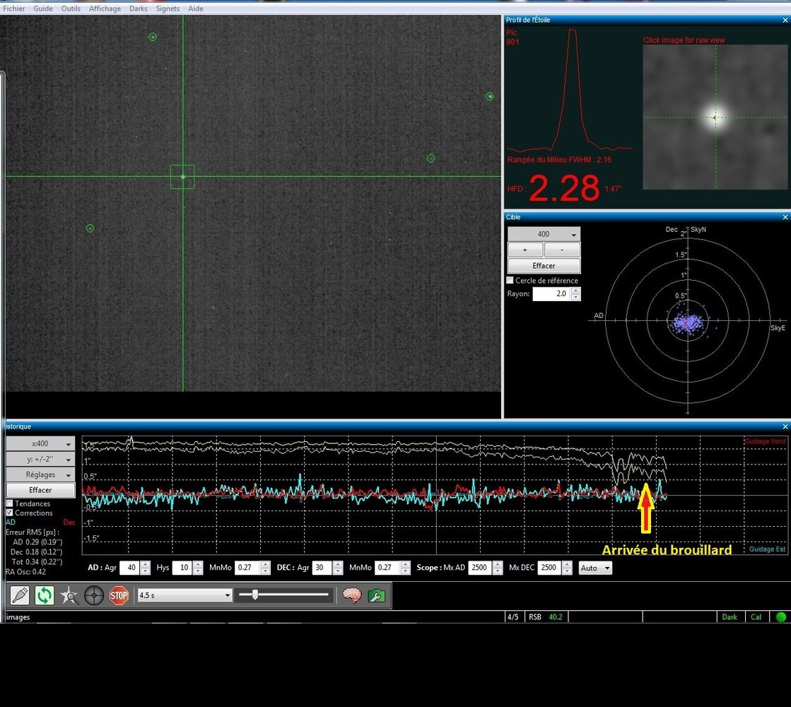 Oui,oui, je me suis mal exprimé quand Je disais "visualiser" je voulais dire augmenter la magnitude visuelle des étoiles vue par la caméra et non pas sur l'écran. Pour le guidage, je pose entre 4 et 4,5s (monture TRIDENT à friction et contrôleur ONSTEP). J'arrive à un RMS entre 0,25 et 0,35 suivant la turbulence avec guidage multi-étoiles bien sûr.
