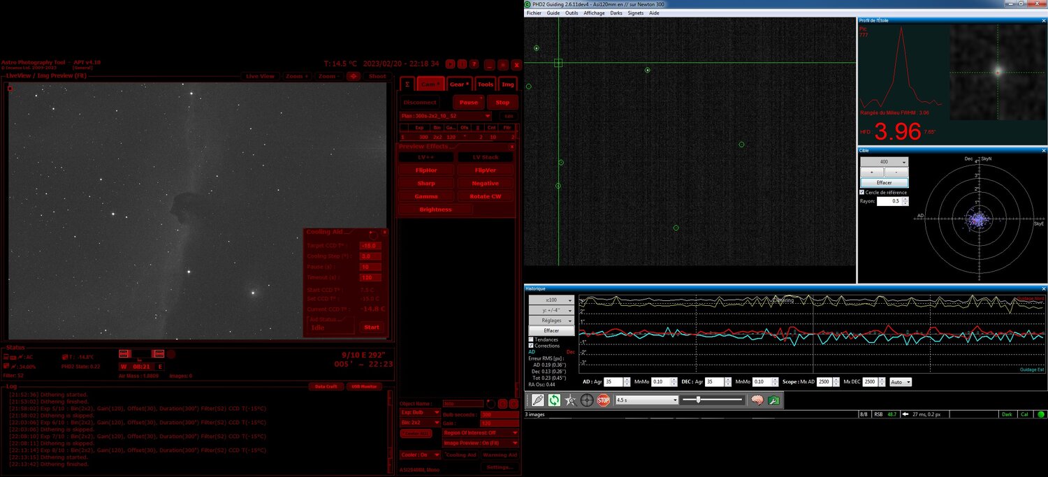 Merci Jean-Marc. Ce qui me manquera le plus est le réglage de la caméra Exp dans la fenêtre flottante. En effet, (je viens de comprendre la différence avec le temps d'exposition de PHD) il me permettait d'augmenter le temps de pose pour pouvoir voir plus d'étoiles dans la fenêtre de visualisation pour la sélection d'étoiles. Je verrai si le réglage du gain sera suffisant. Encore une fois, merci! Alain