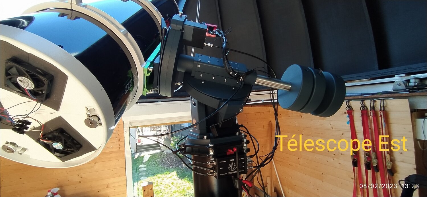 @Phiphi78, Mark de JTW Astronomy utile bien des encodeurs séparés, certes se ne sont pas des encodeurs Renishaw! Ils sont montés en bout d'axe. J'ai mis les encodeurs sur OFF car je me suis aperçu que lorsque je faisais un platesolving et un synchronisation, sur Cartes du Ciel, la cible était bien pointée, mais quelques secondes après le pointage se décalait car le télescope reprenait la position des encodeurs. C'est pour cette raison, entre autres, que je ne soulais pas intervenir ici tant cette monture n'était complètement testée. C'est juste une histoire de temps(weather) !!! A part ces petits soucis, cette monture à l'heure actuelle me suffit amplement. Je ne vais pas pinailler parce que lors d'un Goto, je me retrouve à quelques secondes d'arc de la cible, le principal étant un bon suivi, même avec guidage avec des étoiles bien rondes sur les photos 😁