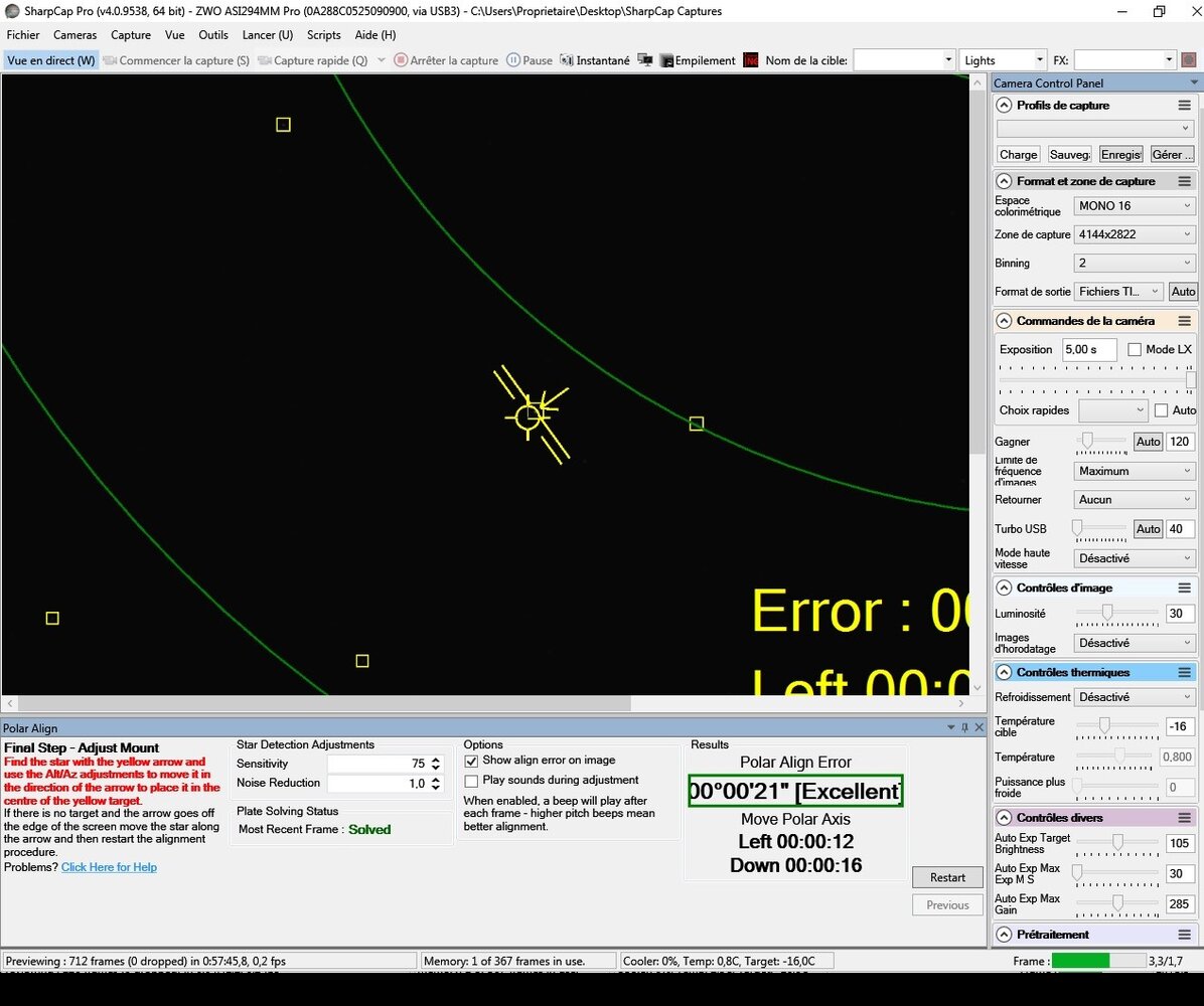 Fin janvier de cette année, j'ai reçu une seconde monture Trident P75 en remplacement de la première. Cette monture est beaucoup mieux finie avec de nombreuses améliorations. (nombreux échanges avec Mark pour lui signaler tous les problèmes rencontrés avec la première monture). - Nouveau système de friction. - Freins ou plutôt système de blocage à certaines positions du télescope dont une dans la direction de la polaire. - Nouveau contrôleur Onstep JTW Astronomy avec antenne et bouton marche/arrêt, très utile en cas d'urgence 😂 - Poignées pour blocage de queue d'aronde du télescope. - Nouveaux contrepoids. Les premiers essais ont été très prometteurs, je dis ont été car depuis les conditions météorologiques ne m'ont pas permis d'aller plus loin dans les tests et je suis toujours dans l'attente d'une véritable éclaircie. Voici ce que j'ai obtenu avant de peaufiner l'alignement polaire. Il y avait beaucoup de turbulences. Voici le résultat: Ensuite j'ai amélioré l'alignement polaire grâce à SharpCap pro (l'achat de la licence en vaut le coût et coup 😁). Un vrai régal car les réglages sont très précis sur cette monture. le resserrage des boulons et écrous m'a fait perdre quelques secondes. ... et comme je l'ai dit plus haut, depuis: Autant j'étais déçu avec la première monture, autant cette nouvelle monture me redonne du plaisir. Bon d'accord, les encodeurs ne fonctionnent toujours pas en boucle fermée (c'est-à-dire qu'ils n'influencent pas le guidage), mais en ai-je vraiment besoin? les résultats me semblent déjà très corrects. J'attends toujours la mise à jour logicielle pour ces encodeurs... Wait and see... En résumé: - Très bonne monture - Destinée à un poste fixe uniquement. - N'est pas destinée au visuel (le changement de train optique peut entrainer un glissement de l'entrainement). - Demande un équilibrage PARFAIT...comme toute monture à friction. - Moteurs débrayables. - Pilotage par USB ou WiFi. - Pour ainsi dire tous les paramètres peuvent être modifiés dans le SWS (Smart Web Server), voir exemples ci-dessous: Voilà. J'espère que ce petit résumé vous apportera satisfaction. Autres questions? Pas de problème!! 😉 En attendant les beaux jours. Alain