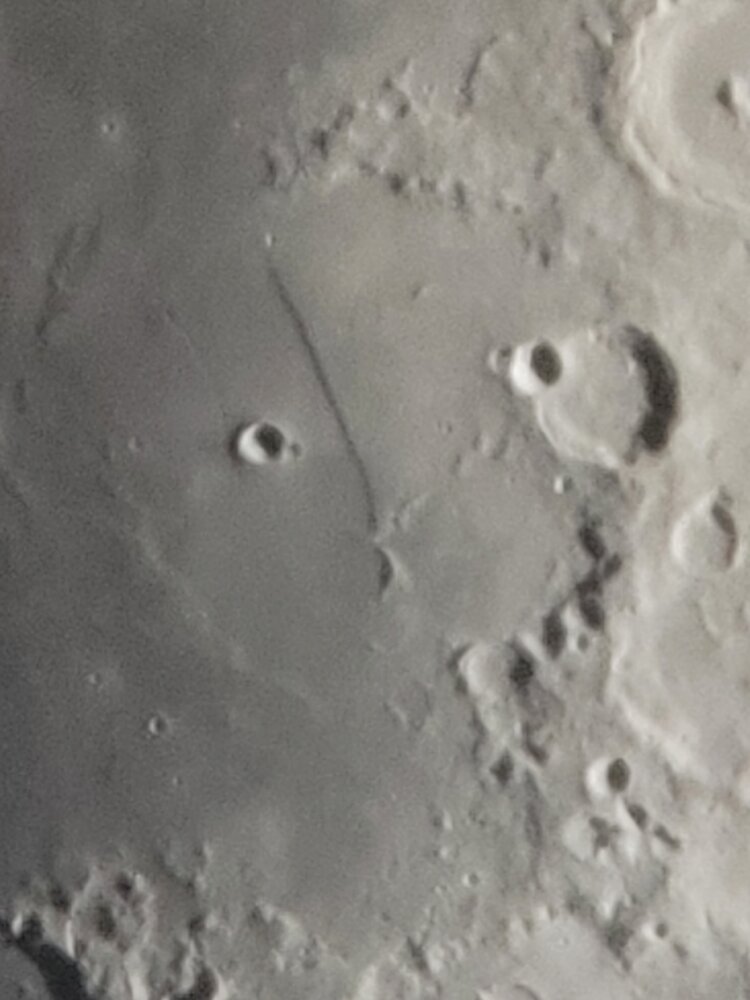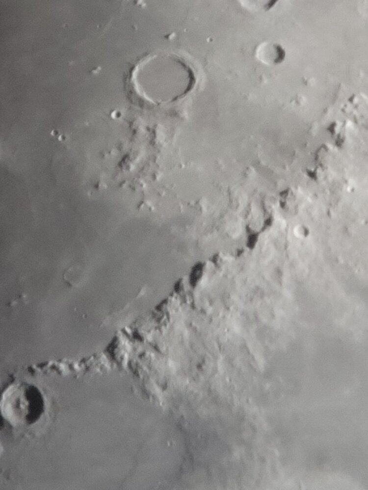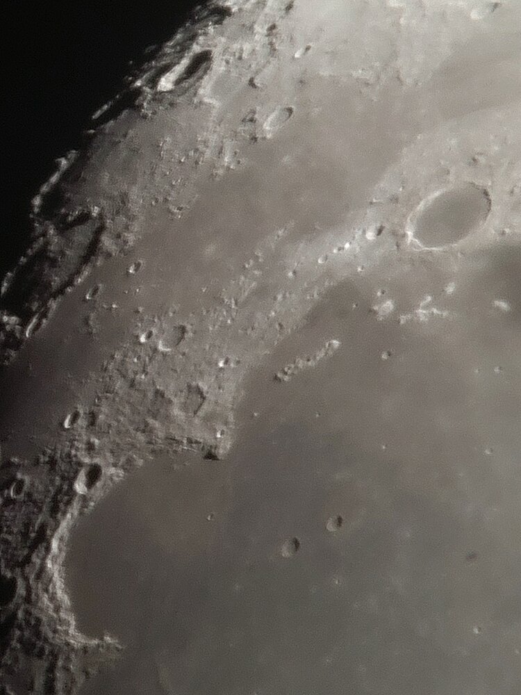Bonsoir à tous. Après ces nombreuses semaines de pluies et mauvais temps... Enfin un croissant de Lune de ce mardi 25 avril vers 22h30. Et une petite balade sur la surface... Le tout au smartphone en afocale derrière un mak 127. -