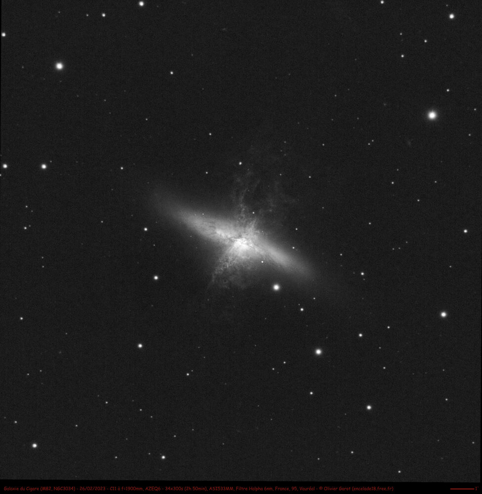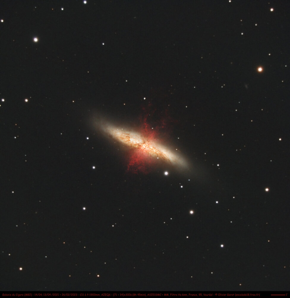 Bonjour à tous et toutes, Voici une reprise d'une image de M82 réalisée à la caméra couleur en 2021 à laquelle j'ai rajouté du signal H-Alpha à la couche Rouge. Sur l'image d'origine apparaissait assez peu les extension HII de la galaxie. Je voulais faire ce rajout sur la galaxie dès que possible et j'ai enfin eu un créneau un peu près correct d'environ 3h en février, une nuit venteuse mais qui m'a permis la réalisation de cette couche tant convoitée Image couleur + ajout monochrome H-alpha 6nm sur la couche rouge, temps total d'intégration de 8h45 : V2: (mise à jour avec fusion un peu améliorée) Image couleur + ajout monochrome H-alpha 6nm sur la couche rouge, temps total d'intégration de 8h45 : V1: Image H-alpha 6nm : Image couleur d'origine : Informations techniques : * Acquisitions image couleur : - Celestron C11 XLT à 1900mm, AZ-EQ6 - Caméra ASI533MC, capteur à -15°C, gain 100, Filtre Baader Neodymium. 76 images de 5min, tri de 71 images retenues (soit 5h55min de pose), nuits des 13, 14 avril 2021. Darks, Flats, Offsets. * Acquisitions image monochrome : - Celestron C11 XLT à 1900mm, AZ-EQ6 - Caméra ASI533MM, capteur à -15°C, gain 100, filtre H-Alpha 6nm. 34 images de 5min (soit 2h50min de pose), nuits des 26 février 2023. Darks, Flats, Offsets. Logiciel d'acquisition : Sharpcap * Fusion des deux images : - Ajout du signal monochrome H-alpha 6nm à la couche rouge de l'image couleur par mode de fusion éclaircir des calques [photoshop]. - Masque de fusion : balance des blancs [AstroSurface]. - Masque de fusion : velvia, renforcement netteté, ombres et hautes lumières [darktable]. * Logiciels : Siril, Photoshop CS6, AstroSurface STELLAR-S2, darktable 4.0.0, Sharpcap, PHD2. * Page M82 sur mon site internet : http://encelade18.free.fr/photos/M82.html