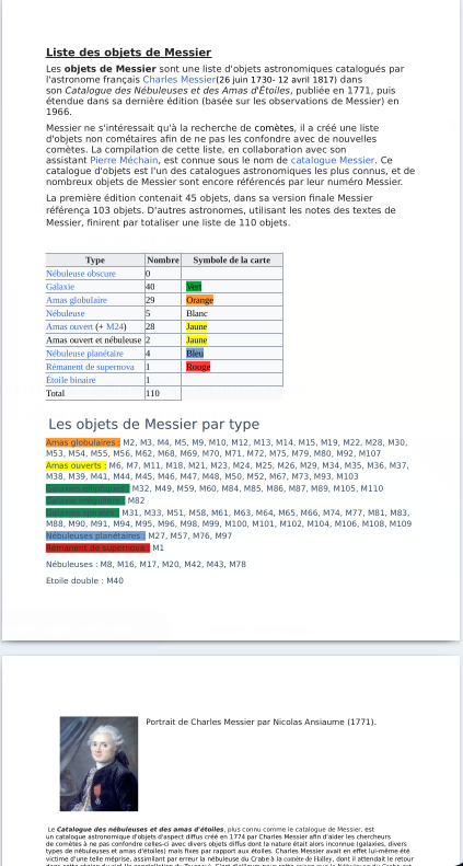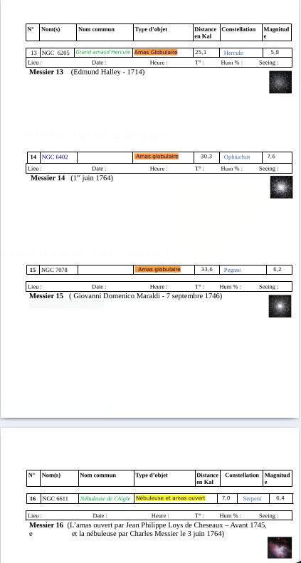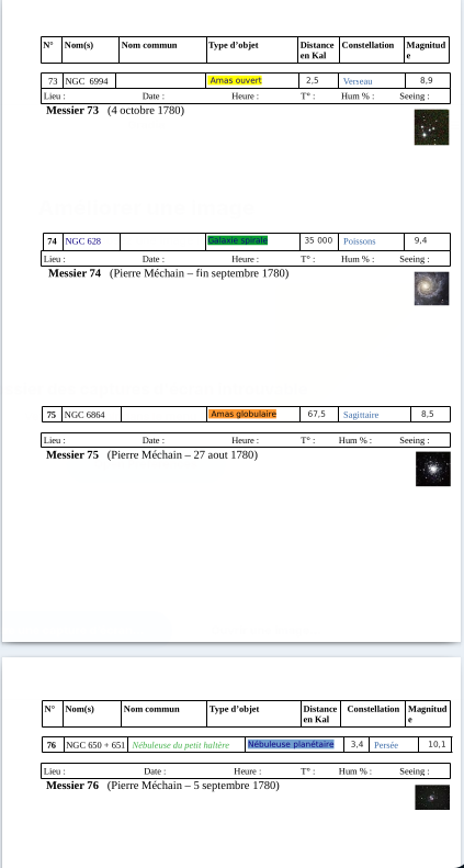 Bonjour tout le monde Je me suis fait un catalogue des objets de Messier, pour pouvoir "me refaire" les Messier avec mon nouveau Dob. Et par le fait, n'en oublier aucun. Le catalogue de Messier s'adressant en premier lieu aux débutant(e)s, je pose quelques pages ici, au cas où ça intéresse quelqu'un ou quelqu'une. J'ai mis les infos de base avec une petite photo pour chaque objet, et le découvreur de l'objet. Un espace pour noter ces observations, la date, le seeing ...Ect... Il fait 20 pages recto/ verso, au format Libre office ou PDF. Bon ciel Pat