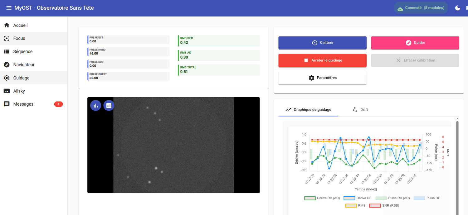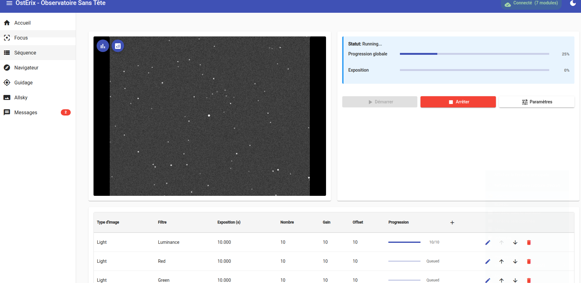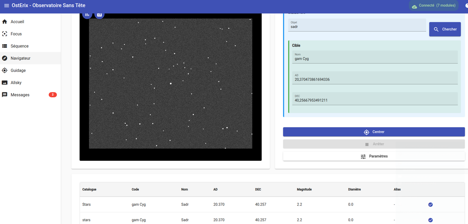 Nous avons maintenant les modules suivants qui sont fonctionnels Focus Séquence Navigateur Guidage J'aime vraiment bien ce que ça donne sur la page d’accueil : Le séquenceur : Le navigateur Dans celui là je vais essayer de fourrer une carte du ciel ... No pain, no gain. J'ai encore qq bricoles à ajuster, certains boutons sont encore un poil récalcitrants.