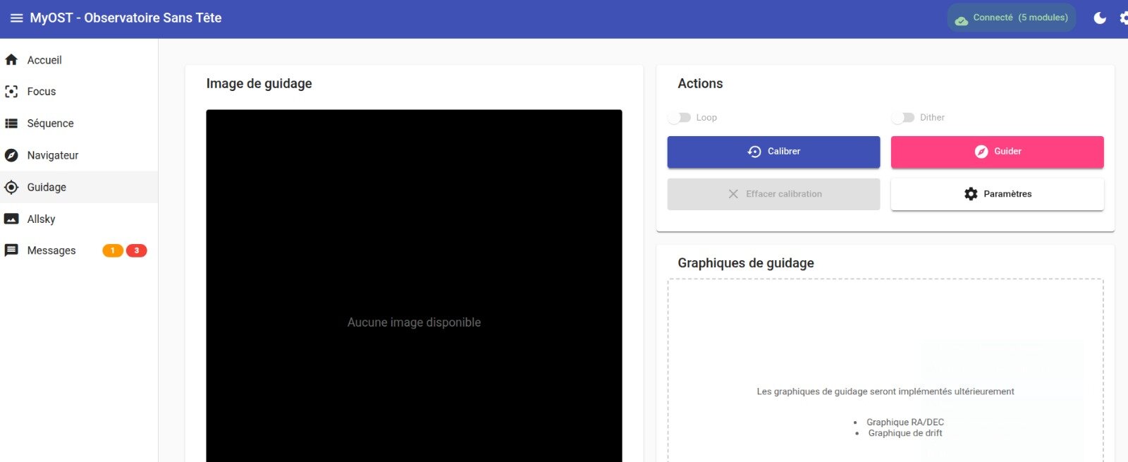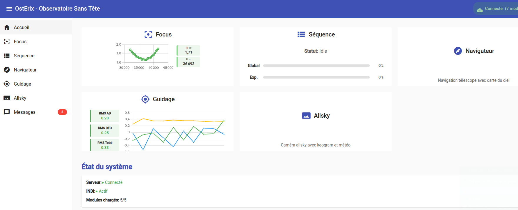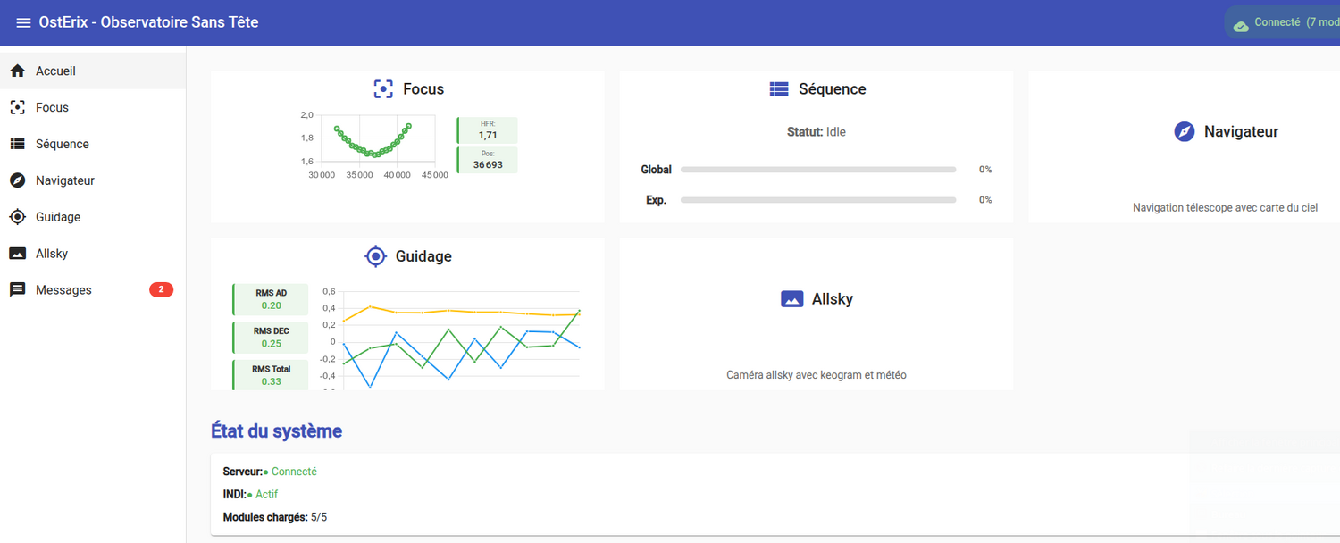 Nous avons maintenant les modules suivants qui sont fonctionnels Focus Séquence Navigateur Guidage J'aime vraiment bien ce que ça donne sur la page d’accueil : Le séquenceur : Le navigateur Dans celui là je vais essayer de fourrer une carte du ciel ... No pain, no gain. J'ai encore qq bricoles à ajuster, certains boutons sont encore un poil récalcitrants.