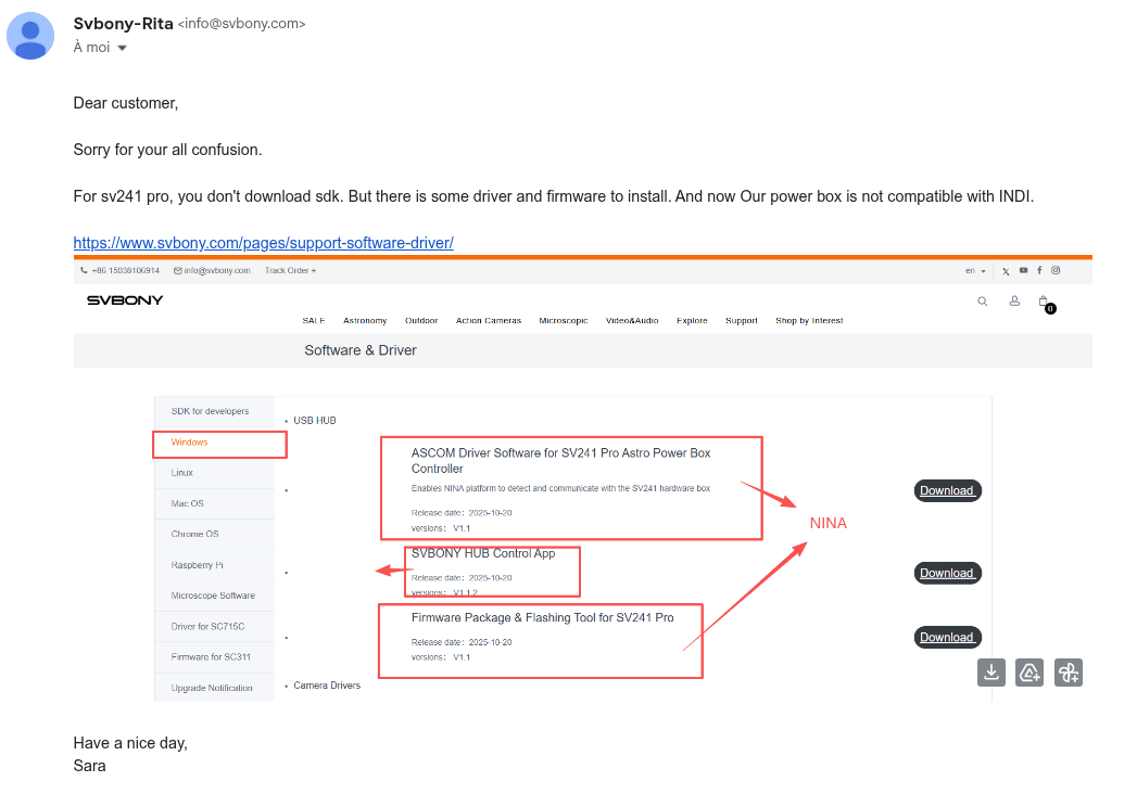 Réponse reçue du support : Au moins c'est clair. Je vais patienter un peu, mais si ça ne décolle pas il va y avoir un SV241 dans les PA. Ou alors je déplombe le protocole avec un sniffer série sur windows, et non ça n'est pas interdit. Je dis ça parce que j'ai vu que ça énumère un CH341 lorsque je le mets sous tension. Donc avec un peu de chance ce sera lisible. M'enfin merde, quoi. Pas le temps. G.