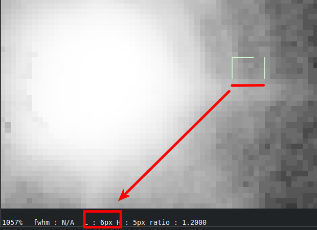 Petite digression sur ce qui me fait écarter la tache d'Airy : le diamètre du lobe centrale se calcule avec ceci, sans tenir compte de l'obstruction : 1.22 * lambda / D Donc à Ha=656nm et D=250mm je trouve 3.2*10-6 radians, soit environ 0.7" d'arc Le diamètre de de lobe central correspond (de mémoire) à l'écartement des franges, qui doivent donc être espacées de 1.4" Mon échantillonnage est ici à 0,38", et je compte 6 pixels d'espacement : soit donc 2.31" c'est pas loin mais c'est pas ça... Ou alors c'est l'effet obstruction centrale qui étalerait les franges ? Aucune idée, mais il me semble que non -
