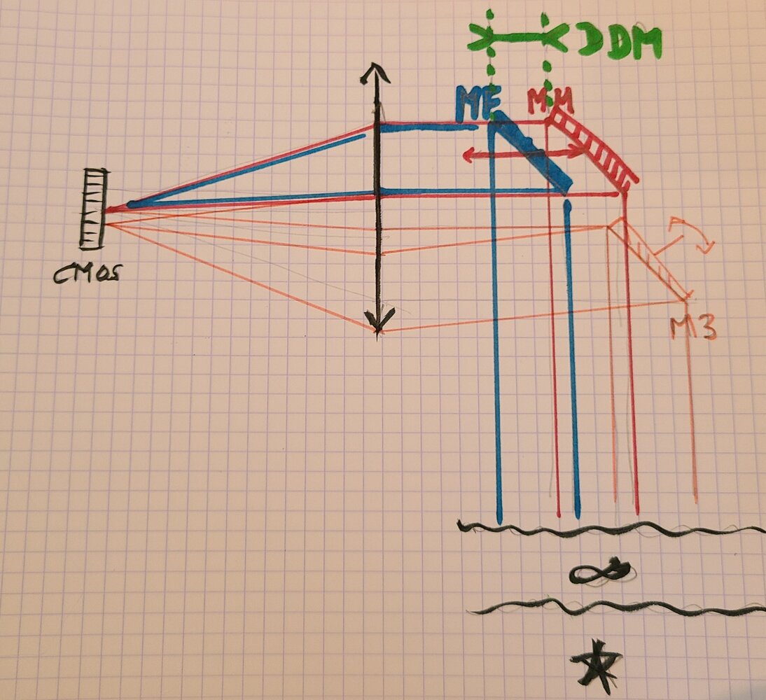 @Gabrielmillou voici un schéma de principe En gros c'est un principe qui reproduit l'interféromètre de Michelson en lame d'air, et on joue sur la différence de marche. En bas à droite étoile à l'infini MM en rouge = miroir mobile MF en bleu = miroir fixe, ajustable pour le rendre coplanaire avec MM M3 en rose on en cause plus tard MM translate selon l'axe du télescope, en restant bien parallèle à MF. (c'est mon problème du moment : ça gigote.) Au foyer sur le CMOS/CCD on récupère l'image d'étoile ayant parcouru deux chemins différents, le rouge est déphasé par rapport à MF avec une différence de marche DDM. MM doit pouvoir se translater de part et d'autre de MF, pour pouvoir passer sur une position la plus proche possible de MF (ddm nulle) Ensuite la manip consiste(rait) à prendre une série de clichés en faisant varier DDM aussi finement que possible : Je devrais donc observer des battements liés aux interférences constructives et destructives entre les deux faisceaux. En faisant passer cet interférogramme dans une moulinette de transformation de Fourier, on devrait pouvoir obtenir une partie du spectre de l'étoile. Et normalement plus on réussira à rendre fine la gestion de la DDM, plus le spectre obtenu sera résolu Et ceci sur tout le champ du capteur CCD : Mais bonjour les gigas de données à gérer 🙂 Bien sur il y a des limitations attendues : -La longueur de cohérence qui va très probablement limiter l'étendue du spectre, ça va obliger à utiliser des filtres (les 100nm de mes RGB ou les 7nm de mes SHO par exemple) -Précision du mouvement : est-ce que mécaniquement je vais réussir à trouver un montage qui permette des pas relativement fixes et homogènes -La turbulence, c'est là que je parle de M3 : avoir une image décalée (que je pourrais tronquer avec un masque coincé entre deux objectifs photo cul à cul) cette image décalée permettra d'avoir une idée des fluctuations liées à la turbulence, et de normaliser le signal passant par MM+MF avant de passer dans la moulinette à Fourier -Puissance de calcul, toutes ces FFT à calculer ça va être une purge. Mais si déjà j'en arrivais là ... Voilà. Gros programme. Va-ce marcher ? On s'en fiche. nota bene : M3 c'est que sur le papier pour le moment 🙂