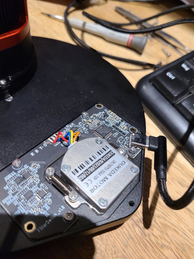 Je dis grave parce que sans solution c'est SAV et j'ai autre chose à faire, Et aussi parce que ça coûte une blinde pour ce que c'est. Je changerai le titre plus tard pour un truc moins énervé si je trouve une issue satisfaisante à cette embrouille. Donc voilà, elle ne voulait rien entendre et ne cessait de me jeter des messages d'erreur improbables (sur indi, genre POA_ERROR_xxx) Bref je l'ai démontée, et j'ai constaté ceci : horreur L'espèce de caoutchouc qui est en contact avec le pignon du moteur qui se met en vrac. Je me dis ça doit être trop serré, je vais démonter le carter de l'autre coté voir si on peut faire quelque chose Bin non : C'est un ressort qui donne la pression, rien à faire, je suis cuit. voyez ce que ça donne quand ça veut bien tourner : 20250429_220958.mp4 Je suis furax Je vous tiendrai au jus, pour le moment je vais tenter de ne faire que des luminances pour ce soir qui s'annonçait si beau. G.