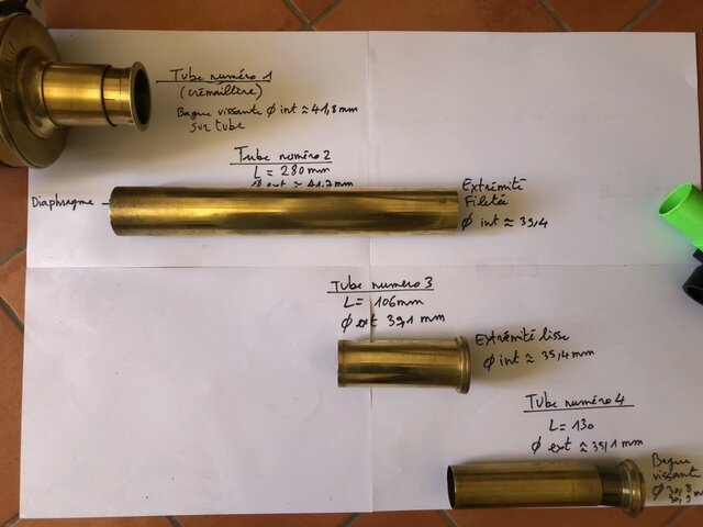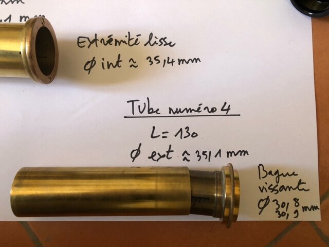 Bonjour à toutes et tous Je m'excuse auprès de ceux qui fréquentent aussi le forum d'à côté où j'ai ouvert un post un peu similaire, mais la population est parfois différente et j'ai plus de chance d'élucider cette histoire de bagues de ma Bardou en jouant sur les deux tableaux... Un schéma et quelques photos étant mieux qu'un long discours… @ Le tube 1 de la crémaillère se termine par une bague vissante dont l'intérieur est lisse ; ce tube est solidaire du système de mise au point et quasi sûrement d'origine @ Le tube 2 glisse dans le tube 1 (la bague vissante présente des gorges pour assurer une friction impeccable et il est très vraisemblable que ce tube soit d'origine aussi. Le tube 2 présente un filetage intérieur femelle d'un diamètre de 39,4 mm ; il est donc certain que l'histoire ne s'arrêtait pas là et qu'il y avait un dispositif présentant un filetage mâle @ Le tube 3 est un intru : il s'encastre en force tant bien que mal dans le filetage femelle du tube 2 ; l'usinage est différent, l'alliage aussi, très probablement le tube numéro 1 d'un autre instrument… C'est quand même dans ce tube 3 que j'enfile le manchon vert pour passer en 31,75 @ Le tube 4 ne me sert pas; il s'enfile comme un charme dans le tube 3. Hasard ou pas, je ne sais pas. Le moletage, l'alliage et le style ressemblent à ceux du tube 1 ; il est probable, mais donc pas certain, que ce soit un Bardou venant soit de cet instrument soit d'un autre. Le diamètre du filetage intérieur de sa bague est de 30,8/30,9 mm ; mon petit doigt me dit que les oculaires se plaçaient là Voilà, je n'en sais pas plus. Le mystère de cette lunette réside probablement dans ce qui se passait en aval du tube 2 qui a disparu Donc je prie le ciel que ceux qui ont, ou ont eu des Bardou, de cette taille ou plus petites car elles devaient être faites sur le même modèle, me lisent et m'aident, si je ne les ai pas trop lassées Merci mille fois Bons cieux Emmanuel -
