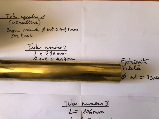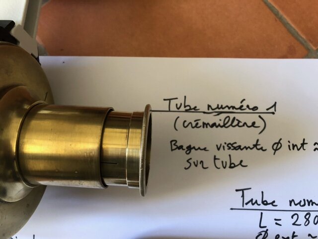 Par contre, je crains que le tube n'ait été raccourci d'une dizaine de centimètres à un moment de son histoire La lulu m'a été vendue avec un empilement de 3 tubes alonge : un long d'une trentaine de centimètres fileté à l'intérieur - tube 2 - qui vient se loger dans le tube actionné par la molette de la crémaillère - tube 1 sur la photo. Puis un second qui vient se loger 'en force' dans le premier, anomalie donc, et ne semble pas dans la même qualité de laiton et pas la même finition. Tube 3 sur la photo. Aux petits trous que l'on voit dessus, je suspecte qu'il provient de l'arrière d'un autre instrument, les trous étant ceux qui permettaient d'un fixer une crémaillère. Et absent sur la photo, un quatrième tube, que je n'utilise pas, qui coulisse gentiment dan le tube 3. Et donc bizarrement, le tube 2 n'a pas une longueur suffisante, même avec un renvoi coudé... d'où la présence du putain de tube 3 fixé à la sauvage. Et bizarrement, les trous permettant la fixation de la gouttière/queue d'aronde pour la monture me semblent un peu trop avancés... Tout ça me fait suspecter que le tube a été coupé d'une dizaine de centimètres au niveau de la partie supérieure. Il y a des traces de coupe mal finies qui me le font penser aussi. Je pense que les établissements Bardou auraient pris le temps de passer un petit coup de lime pour faire joli, quant bien même l'extrémité du tube est cachée par le barillet de l'objectif! C'est pas sûr mais c'est bien possible. Même si la raison d'une telle décapitation est incompréhensible. Mon vendeur m'a expliqué aujourd'hui qu'il avait acquis le tube auprès d'un gars un peu marginal qui le tenait de son père. Il semblait ne pas avoir de lumière à tous les étages ; impossible de revenir en arrière pour connaitre l'histoire de la lunette. Dans ces conditions, ça serait coton de remettre Grand Mère dans son état d'origine! Ce n'est pas rédhibitoire pour l'utilisation de la lunette mais ce serait du massacre. Même s'il y en a de bien plus graves en ce moment... Bons cieux à vous Emmanuel