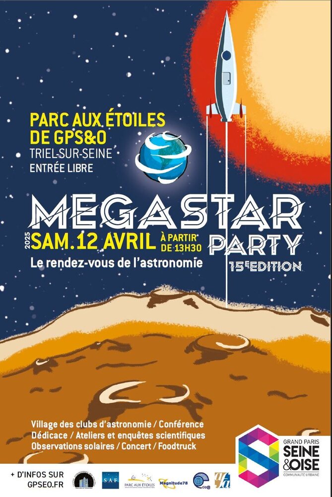 Le Parc Aux Etoiles et le Centre Astronomique des Yvelines coorganisent à Triel-sur-Seine la 15ème Méga Star Party, le samedi 12 avril 2025.