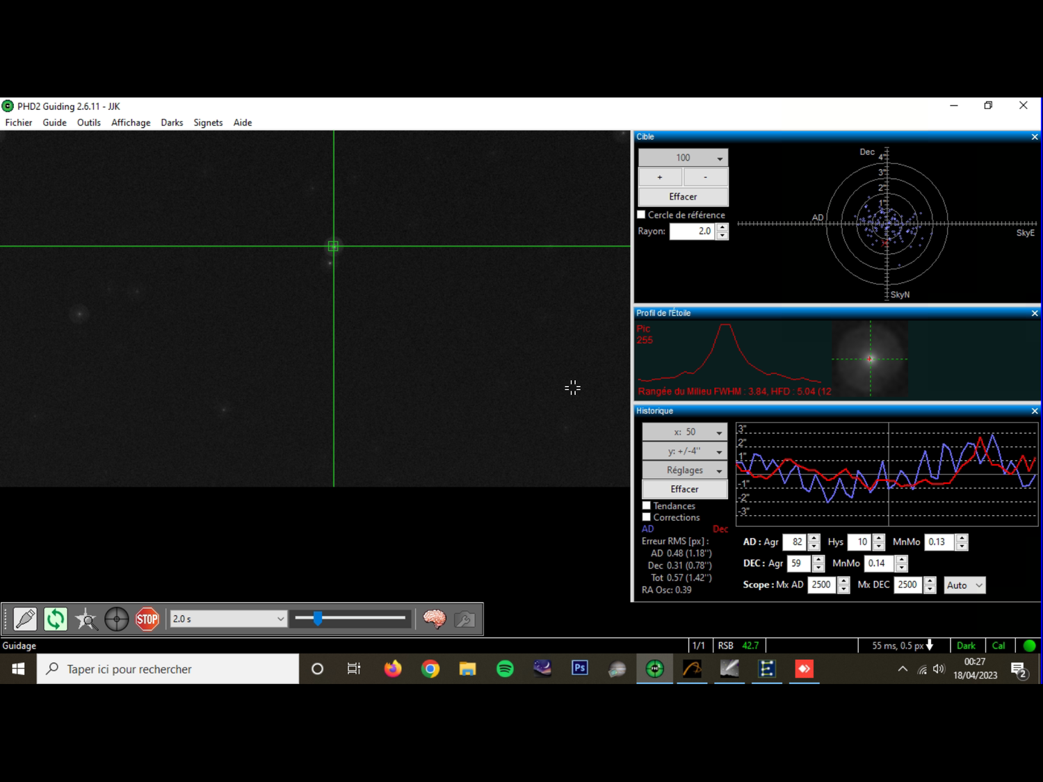 4. Bonjour ! J'aurais besoin d'aide pour affiner mes paramètres de guidage (j'ai déjà suivi divers tuto). Voici mon matériel: - 150/750 - EQ6 PRO GOTO non modifiée - Imageur : Canon 600D - Caméra de guidage : ASI290MM - Instrument de guidage : lunette SVBONY 240mm Vous trouverez ci-joint un screen de cette nuit, le seeing était de 1.7" et la mise en station correcte (effectuée avec Sharpcap) La vitesse de guidage est réglée sur 0.8 pour les deux axes. Merci d'avance et bon ciel !