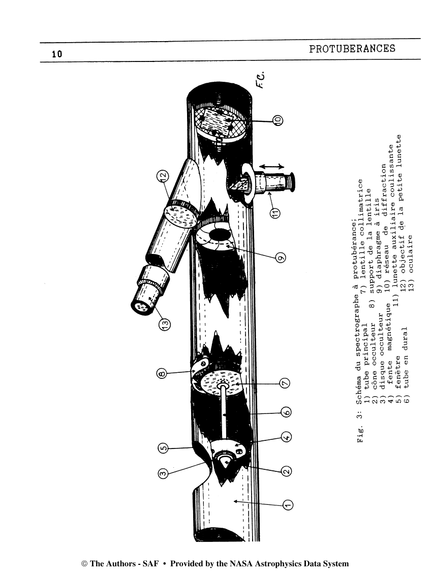 ...Une vieille méthode qui n'utilise pas de filtre H alpha : un spectroscope à fente large. Jules JANSSEN en 1868 avait découvert lors d'une éclipse que l'on pouvait observer les raies d'émissions des protubérances même en dehors des éclipses avec un spectroscope en mettant la fente d'entrée tangente au bord solaire. HUGGINS par la suite eu l'idée qu'en élargissant la fente on pouvait voir les protubérances en entiers au lieu de les explorer par tranches. La méthode dite de la FENTE LARGE était née. Dès lors les observatoires observèrent les protubérances quotidiennement ainsi jusqu’à la fin des années 1950 lorsque le filtre H alpha de Lyot fut inventé et généralisé.
