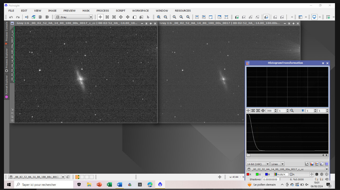 2. Bonjour, Je rencontre un problème que je n'ai encore jamais eu, à savoir une image traitée plus "bruitée" une fois calibrée que non calibrée : Il s'agit d'une image en h alpha (6nm) à laquelle je retire dark (utilisé avec les autres couches sans problème, même expo, même temp, même gain etc etc) et le flat calibré avec son darkflat. On voit bien que l'ampglow a bien disparu et le signal plus fort, mais l'image traitée a du bruit qui en fait est plutôt une pixellisation déjà visible. Voici une image non traitée à droite et une traitée à gauche ainsi que l'histogramme ou la première partie du pic reste hors graph.... Si vous avez une idée, je suis preneur…. et je vous en remercie 😉