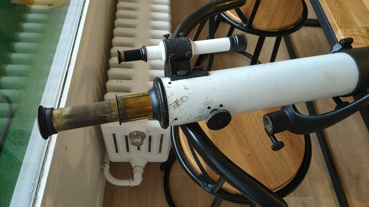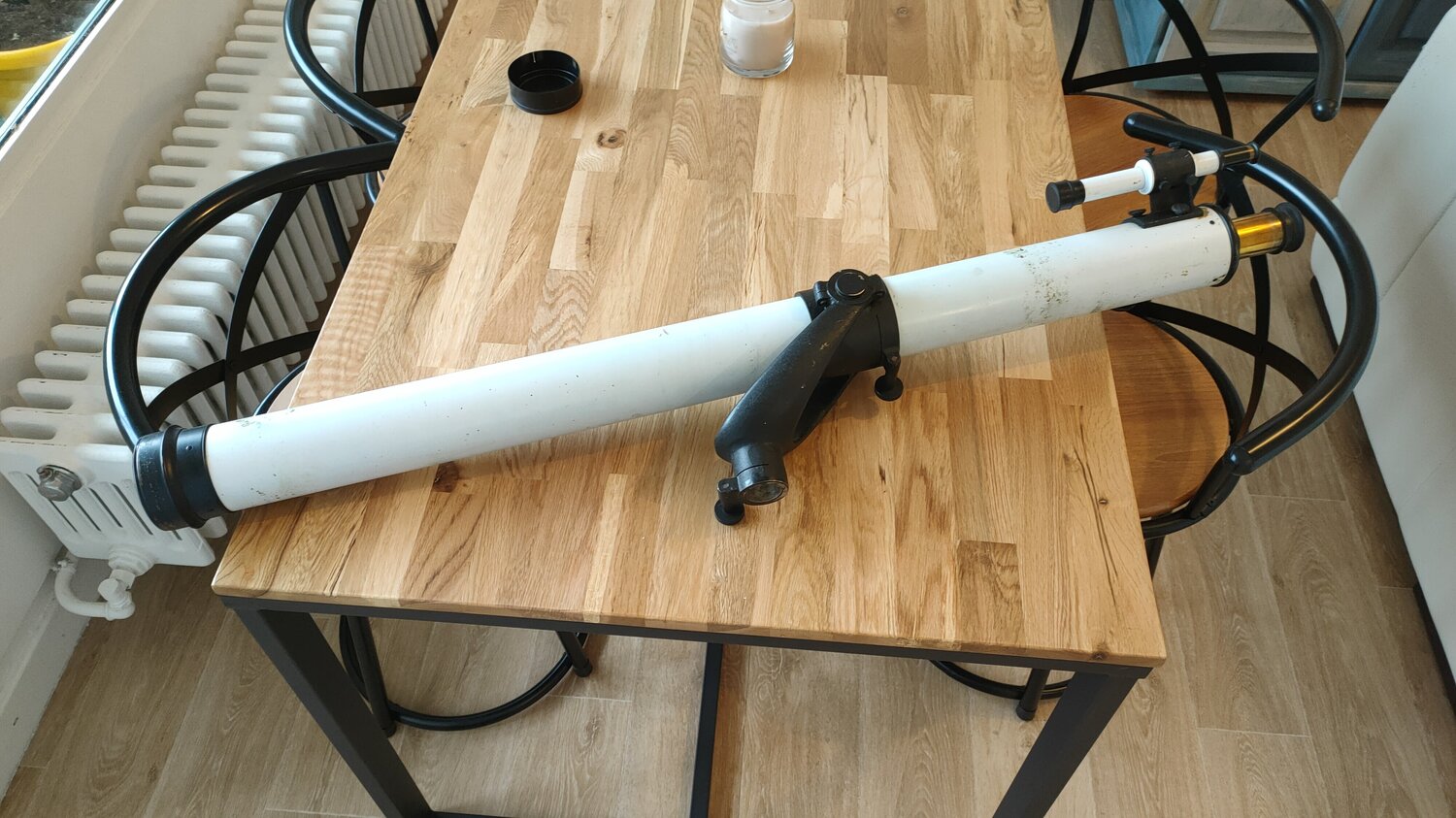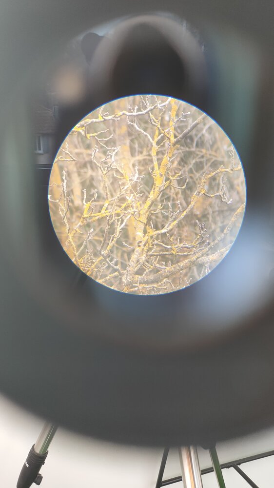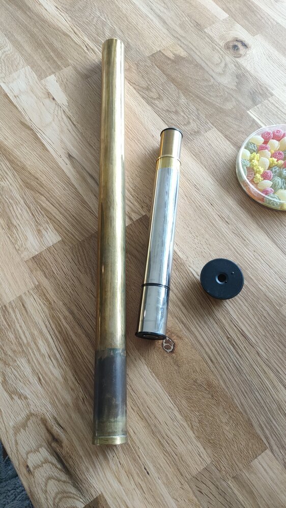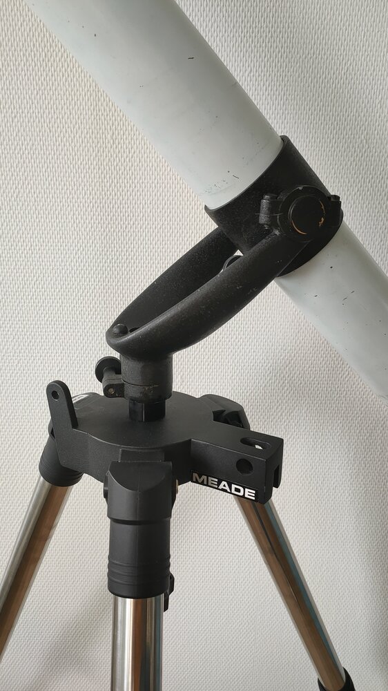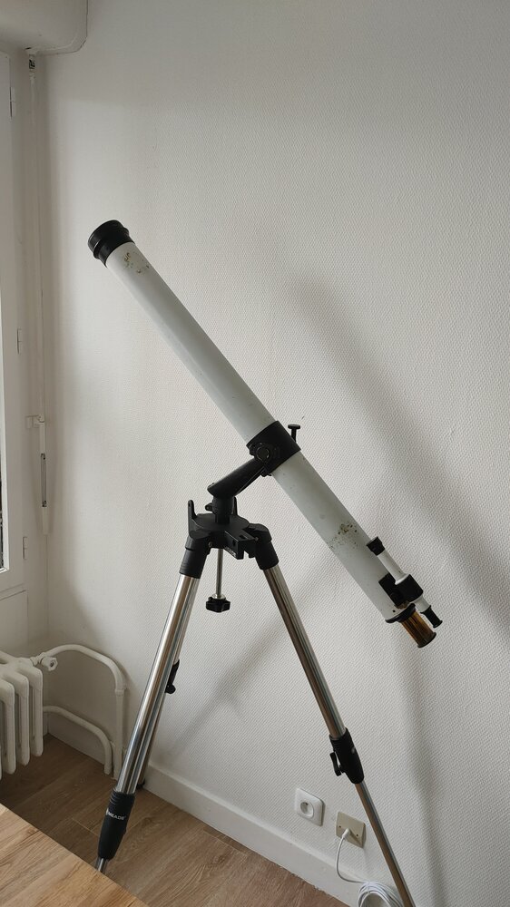 4. J'ai adapté en attendant la lunette sur un trépied d'etx 125 Une fois monté, c'est clair, on sent pas le poids, ca coulisse tout seul, ca devrait être très agréable a l'utilisation Je vous montre l'optique Elle n'est pas immaculée, il y a des trace de champignons, incrusté, et deux ou trois autres tâches, pas grand chose a mon sens pour une lunette de cette âge L'oculaire terrestre a une partie chromé, peut être quand enlevant le redresseur en laiton, on retrouve un oculaire astronomique, a tester