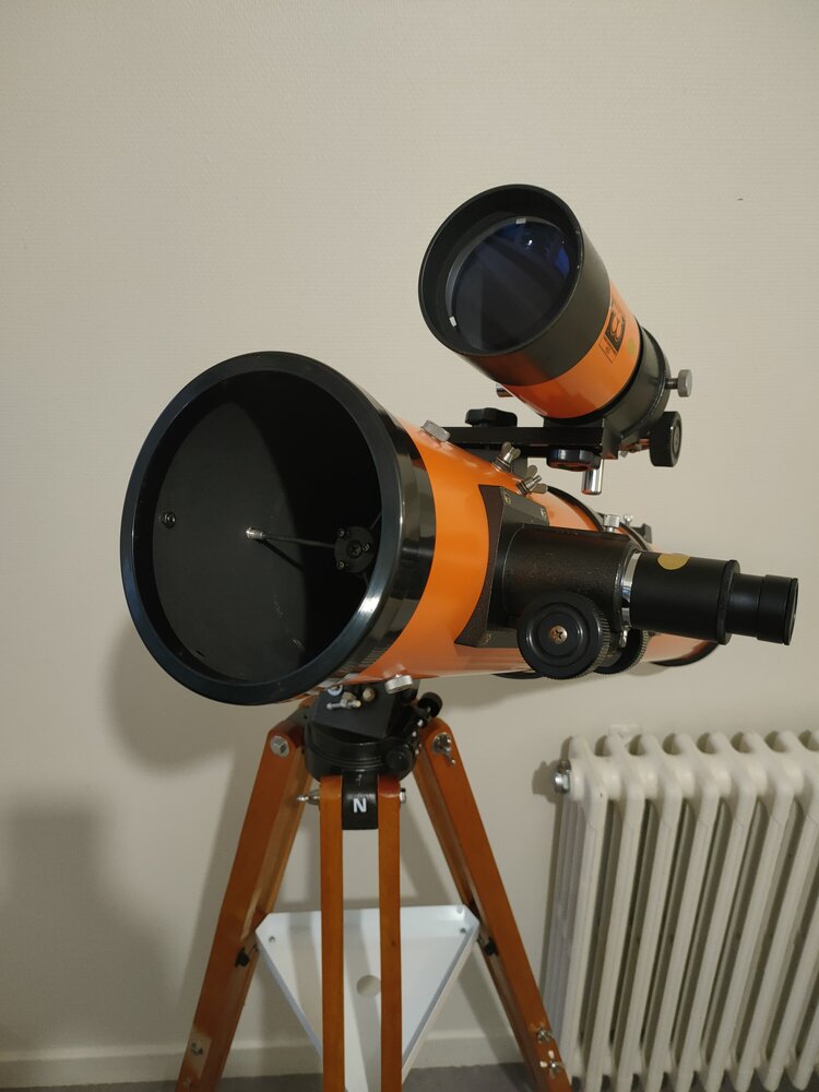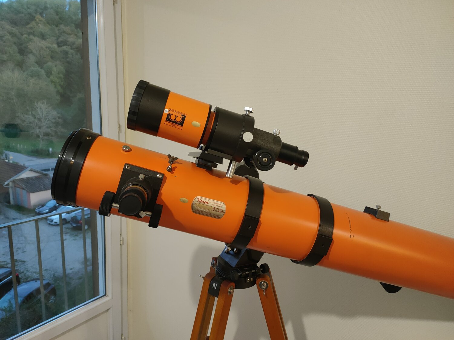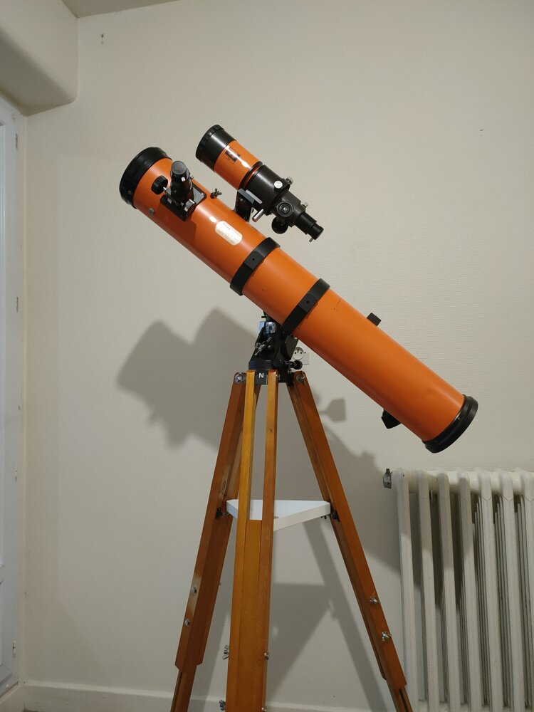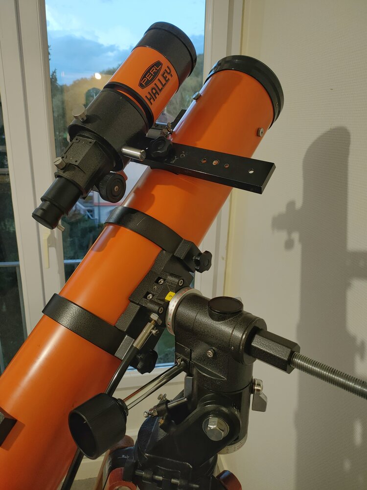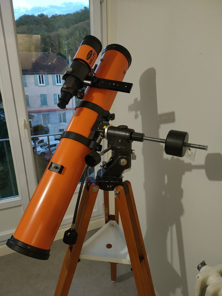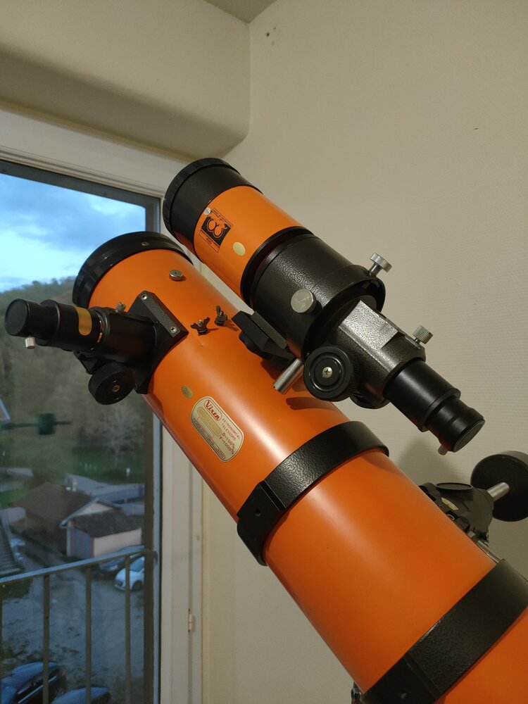 Salut le club Je reste dans ce fil, de 100-1000. Je vous montrerai le Perl Royal plus tard. Voici un modèle équivalent a celui présenté par l'auteur du fil, mais en version "Halley". Il va bientôt revoir les étoiles. On peu voir ce modèle parfois accompagné de sa lunette guide 60-900 60L. Mais pour moi pas vraiment d'intérêt a lui poser la 60L pour du visuel. La 60 ne fera pas gagner du champs de vision, elle ne fera pas mieux en qualité d'images, n'y même gagner de la lumière, et la focal est trop proche du télescope, donc aucun intérêt a mon goût. Avec la Perl Halley par contre, l'intérêt, c'est qu'elle va servir de "gros chercheur" on peu faire du grand champs d'un côté, et, bien aligné, rentrer dedans de l'autre côté avec le télescope et sa qualité d'image. Et niveau cohérence Visuel ... Je ne l'ai pas encore testé me reste a démonter les miroir pour les nettoyer ils sont vraiment sales, le télescope a été lui nettoyé, il souffre de quelques traces d'usage, mais globalement, on dira qu'il est bien dans son jus. C'est le télescope qui était dans les petites annonces il y a quelques semaines, vendu par un membre du club. Il est posé sur une News Polaris. Pas évident de poser une lunette sur un newton, quelques problème de cohérence peuvent se poser celon la position du télescope (risque de ne plus pouvoir accéder a la lunette confortablement celon la position du scope sur le Ciel) Près du porte oculaire est légèrement déporté vers celui ci me semble la meilleure solution pour avoir la lunette toujours accessible. Niveaux équilibrage, aucun problème Je lui ajouterais quand même un chercheur 6x30 vixen, orange bien sur, ou alors sur la Halley directement, ou sur le tube lui même, bien positionné. Puis pour l'habiller un peu, je lui ajouterais un autocollant que je n'ai pas encore trouver, de la comète de Halley. Ca devrait faire un belle ensemble. Je vous montre le résultat avec la Halley en guide, ca en jette je trouve. -