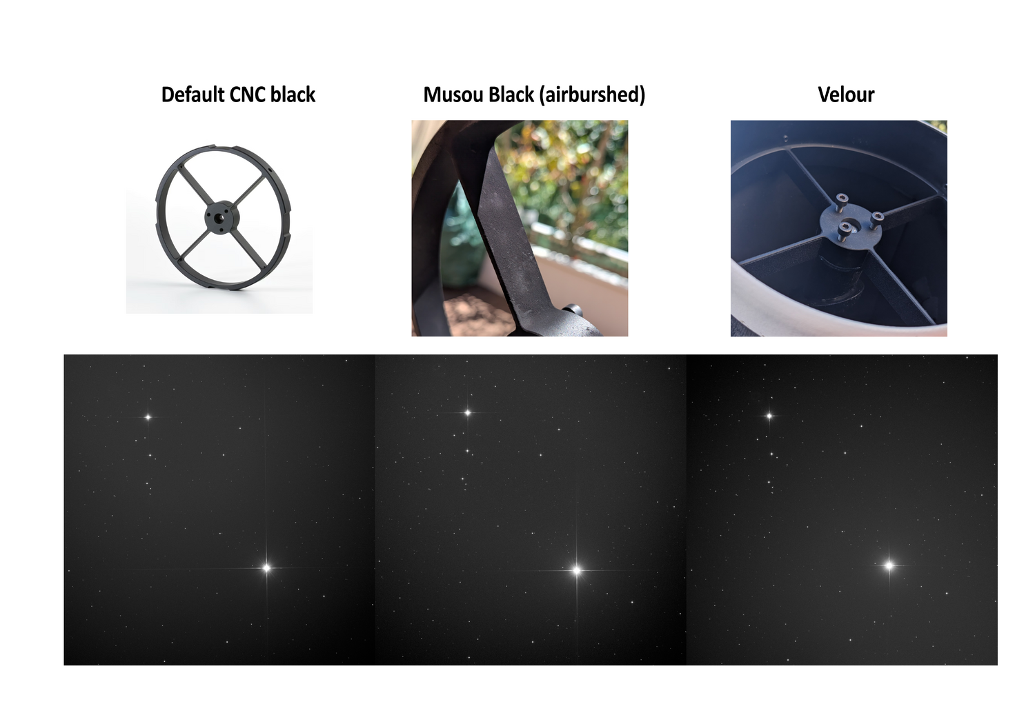 Bonne question ! J'ai l'impression que l'aérographe permet de faire cet effet texture justement, j'ai fais 2 couches regulières mais à des distances différentes et saturation en peinture différente avec 1h se séchage entre les deux, puis refais la même chose plusieurs jours plus tard. Oui je suis d'accord, Michael me disait que sa peinture était vraiment très cher et utilisé sur des composants qui vont dans l'espace. Personnellement je serai OK de payer 50€ en plus pour que ce soit fait de base (ce que je lui ai dis). La où je trouve ça problématique, c'est sur des télescopes à +2000€ où tu attends à avoir quelque chose de nickel dès le départ (et pas à devoir changer des trucs ou faire de la peinture). -