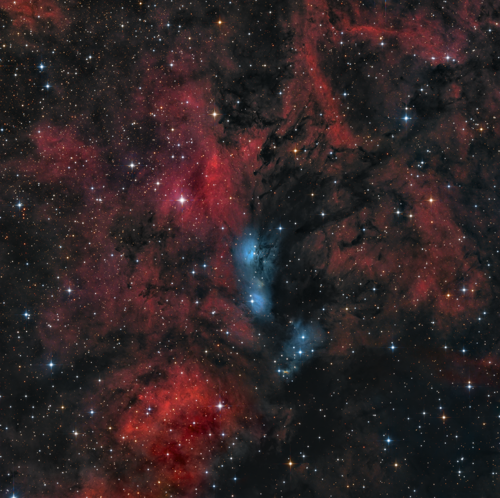 J’ai commencé ce projet lors de la pleine lune de juin et je l’ai poursuivi aussi longtemps que le temps et mon emploi du temps me le permettaient. Cette cible n’était pas facile, elle n’était visible pour moi qu’après minuit et pendant quelques heures jusqu’à l’aube. Bon sang, ces nuits de juin ne sont vraiment pas longues ! J’ai découvert que cette nébuleuse était plutôt difficile à capturer. La poussière sombre a été relativement facile à faire ressortir, projetant son ombre sur la riche région Hα du Cygne. Mais la nébuleuse par réflexion a été plus compliquée : elle n’a commencé à révéler quelques détails faibles qu’après 10 heures de pose, et reste encore peu lumineuse sous mon ciel Bortle 6-7. Quand on lit que les nébuleuses par réflexion et par émission sont deux types différents, cette image l’illustre parfaitement. Voici une animation de la couche Hα avant le mélange avec la luminance — et la nébuleuse par réflexion n’y apparaît pas du tout ! La gestion des couleurs a aussi été un défi : tout ressort en rouge dans cette zone du ciel, donc il a fallu maîtriser le rouge et la richesse de l’Hα pour obtenir une image équilibrée. Au final, ce fut un très beau projet que j’ai beaucoup apprécié ! En détails : - Telescope 130PDS - Caméra ZWO533MM Pro - Filtres Antlia LRGB et SHO 3nm - Monture EQ6R Pro - 31h de pose réparties sur le mois de juin - Prise de la banlieu Lyonnaise (bortle 6-7)