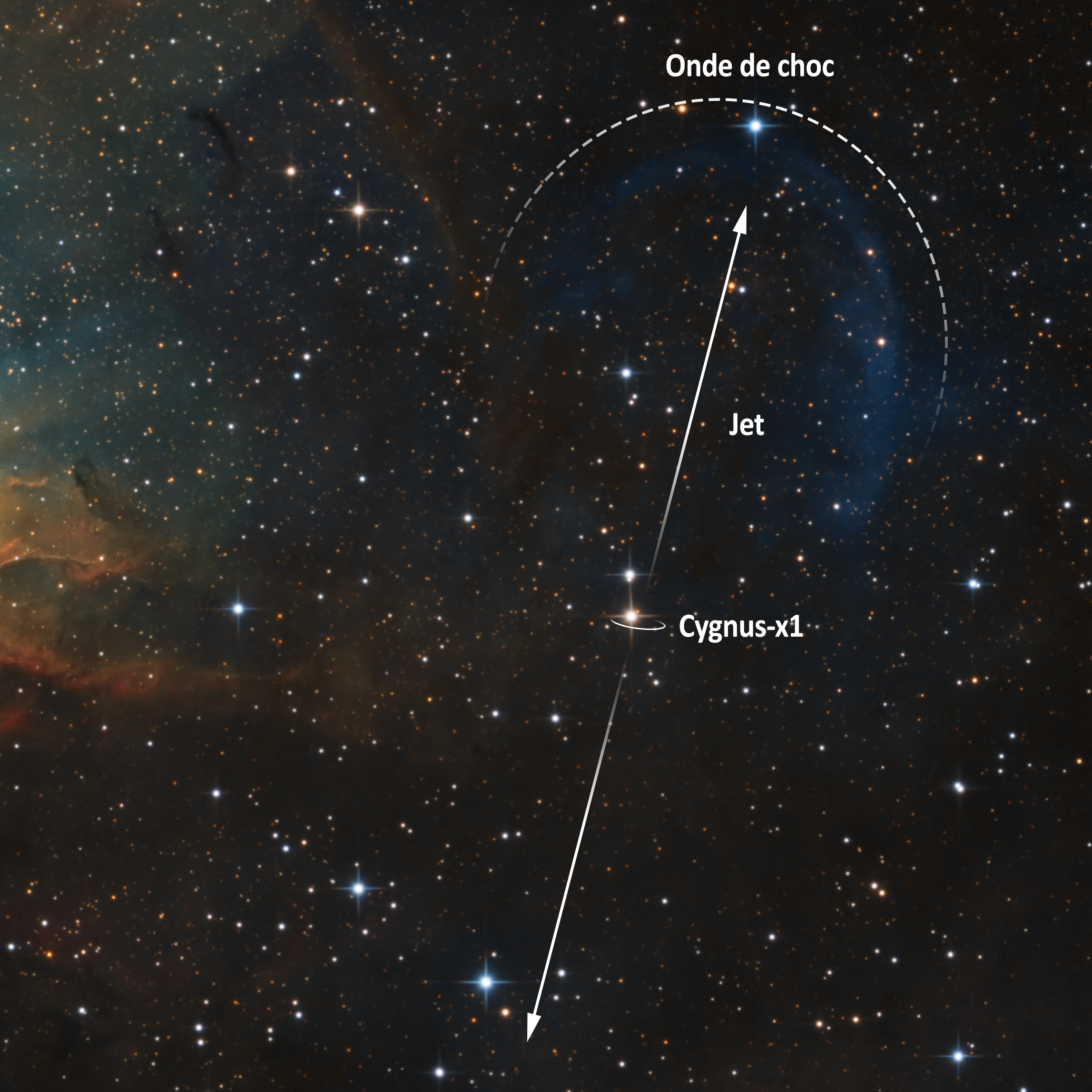 Hello ! Je vous partage ma dernière image. À proximité de la Tulipe se situe Cygnus X-1 qui est un système binaire composé d’un trou noir (15 millions de masses solaires) et d’une supergéante bleue (21 millions de masses solaires), séparés de 0,2 unités astronomiques, en orbite sur une période de 5,8 jours. L’accrétion de matière depuis la supergéante vers le trou noir alimente un disque qui émet des rayons X, ainsi que des jets relativistes. L’un de ces jets heurte le milieu interstellaire proche, formant une onde de choc en forme de croissant, ici en bleu à droite de l'image. Cygnus X-1 a été identifié en 1964 comme une source intense de rayons X dans le Cygne. En 1971, son association avec l’étoile HDE 226868 a révélé la présence d’un objet compact, trop massif pour être une étoile à neutrons. Il est ainsi devenu le premier candidat sérieux au statut de trou noir stellaire. La photo : 26h de pose avec un télescope newton skywatcher 130pds Caméra 533MM PRO et filtres Antlia 3nm Monture EQ6R-PRO Prise depuis la banlieue lyonnaise