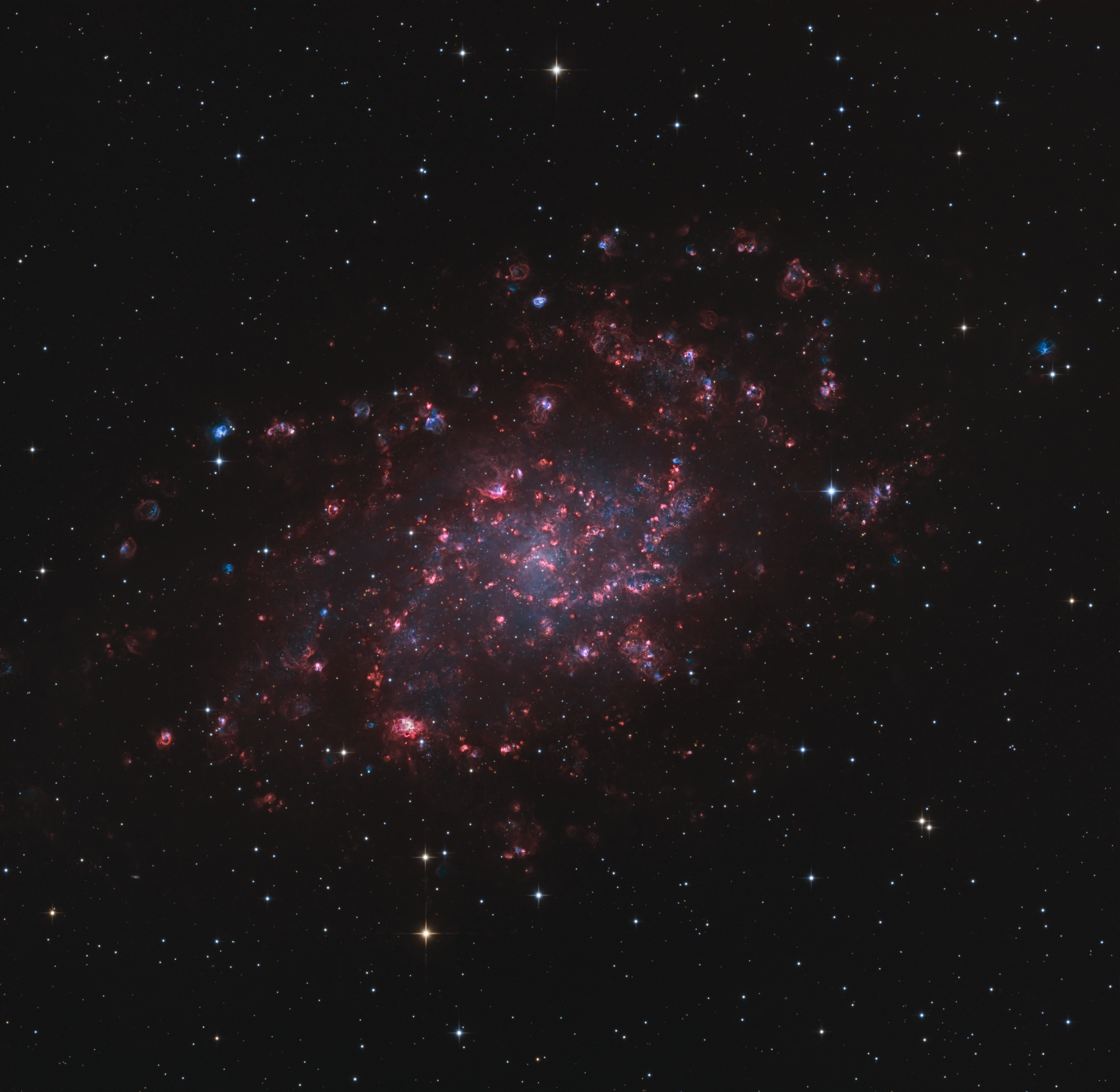 Il s’agit d’un projet secondaire, commencé lorsque ma cible principale était devenue trop basse sur l’horizon et qu’il me restait encore du temps d’acquisition. C’est en quelque sorte la saison 1 de M33, réalisée uniquement en HOO. J’espère pouvoir la compléter prochainement avec des données en LRGB pour un rendu plus complet et naturel. Temps d’intégration : Hα : 7 h 45 OIII : 5 h 20 Total : 13 h 05 Équipement : Télescope : Sky-Watcher Explorer 130PDS Caméra : ZWO ASI533MM Pro Monture : Sky-Watcher EQ6 Pro Filtres : Antlia 3 nm Hα & OIII (1.25") Accessoire : ZWO ASIAIR Pro Logiciel : PixInsight (Pleiades Astrophoto) Objets : Galaxie du Triangle (M33) Triangulum Pinwheel NGC 595, NGC 598, NGC 604