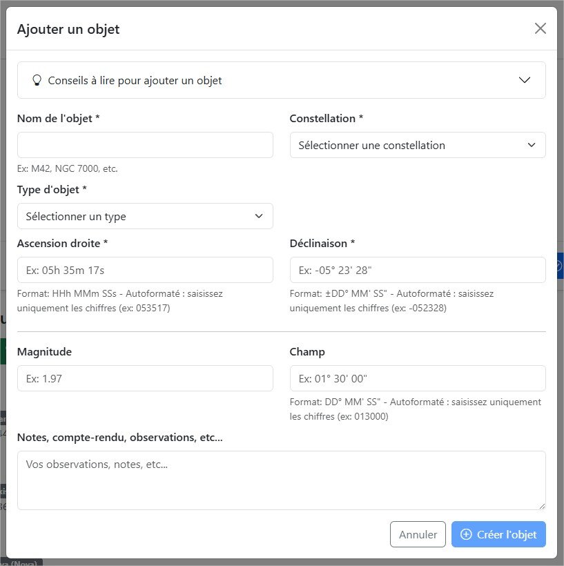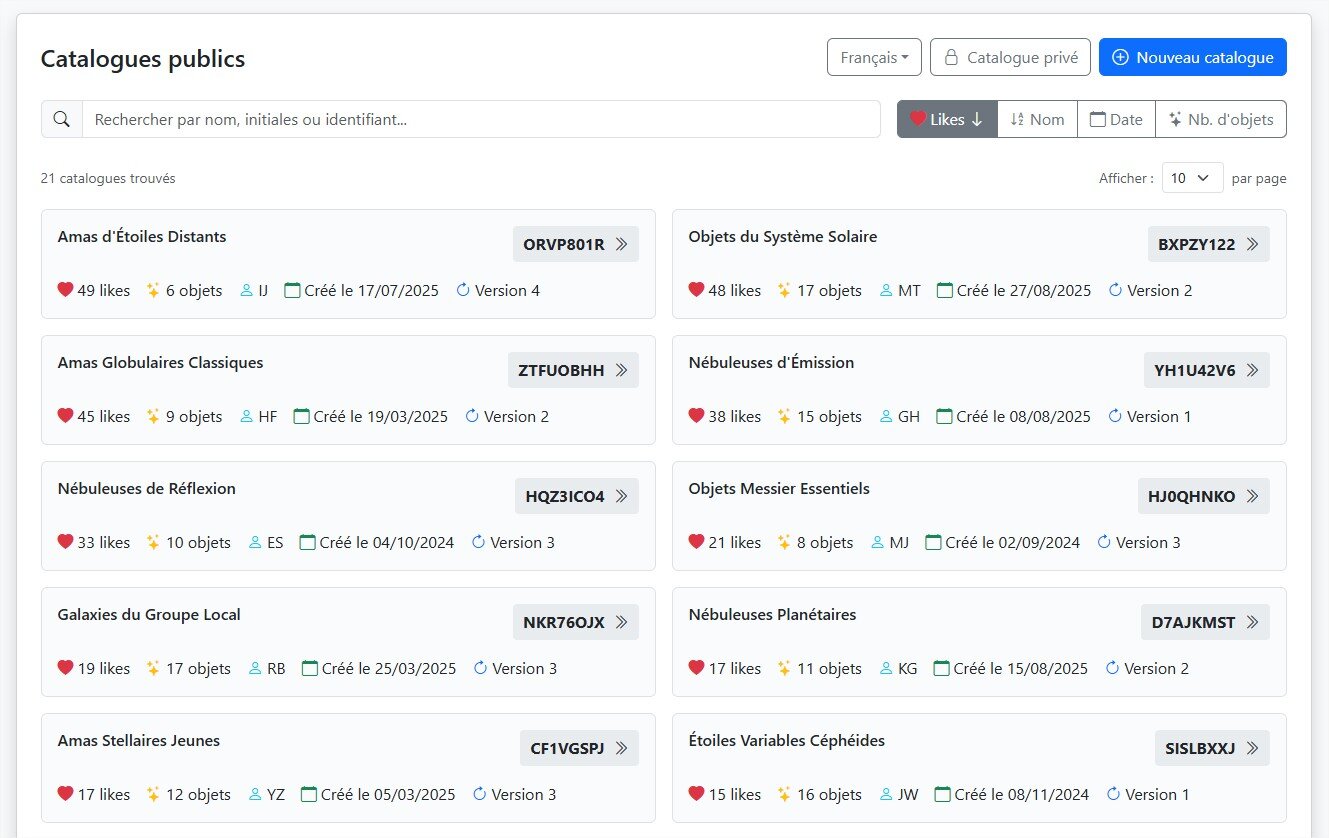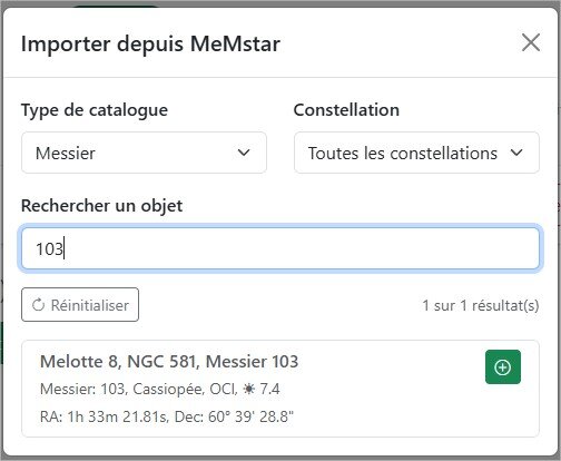 Bonjour ! Nous vous avons préparer une belle surprise pour cette rentrée 2025 : Catalist ! Ce tout nouvel outil vous permet de créer vos propres catalogues et de les ajouter dans votre application MeMstar. C'est un sacré avantage pour préparer vos soirées et pour partager avec vos ami(e)s les plus beaux objets célestes qui vous tiennent à coeur ❤️ Vous pouvez soit ajouter les objets déjà existants dans MeMstar ou ajouter un objet de A à Z. Vous pouvez aussi remercier le créateur du catalogue par un "like" mais aussi partager le catalogue sur Facebook. Nous avons aussi pensé l'application pour qu'elle soit intuitive et simple à prendre en main. L'outil est déjà traduit dans les mêmes langues que MeMstar. Pour utiliser Catalist, rendez-vous sur https://memstar.fr/catalist/ et, de préférence, téléchargez la version bêta-testeur de MeMstar (v1.12.0) pour Android (Désolé d'avance pour iOS, il faudra encore attendre un peu). Depuis MeMstar 1.12.0, vous trouverez un nouveau menu "Communauté' puis sur le bouton "Consulter les catalogues de la communauté". En tant que créateur, vous pouvez partager vos catalogues à d'autres astrams en mode public ou bien le garder pour vous en mode privé le temps de le mettre au point. Et bien sûr, Catalist est gratuit et il n'est pas nécessaire de créer de compte ! Catalist est encore en phase de test, c'est d'ailleurs pour ces raisons que l'application est en bêta. Nous vous invitons à manipuler l'outil et nous donner un retour sur vos impressions, vos idées et (je ne l'espère pas), les bugs rencontrés. Voici quelques images de l'application, histoire de vous donner une idée 🙂 Merci à vous ! PS : Même si le temps ne s'y prête pas, vous pouvez toujours simuler une observation en intérieur, même avec MeMstar hors du télescope pour tester.