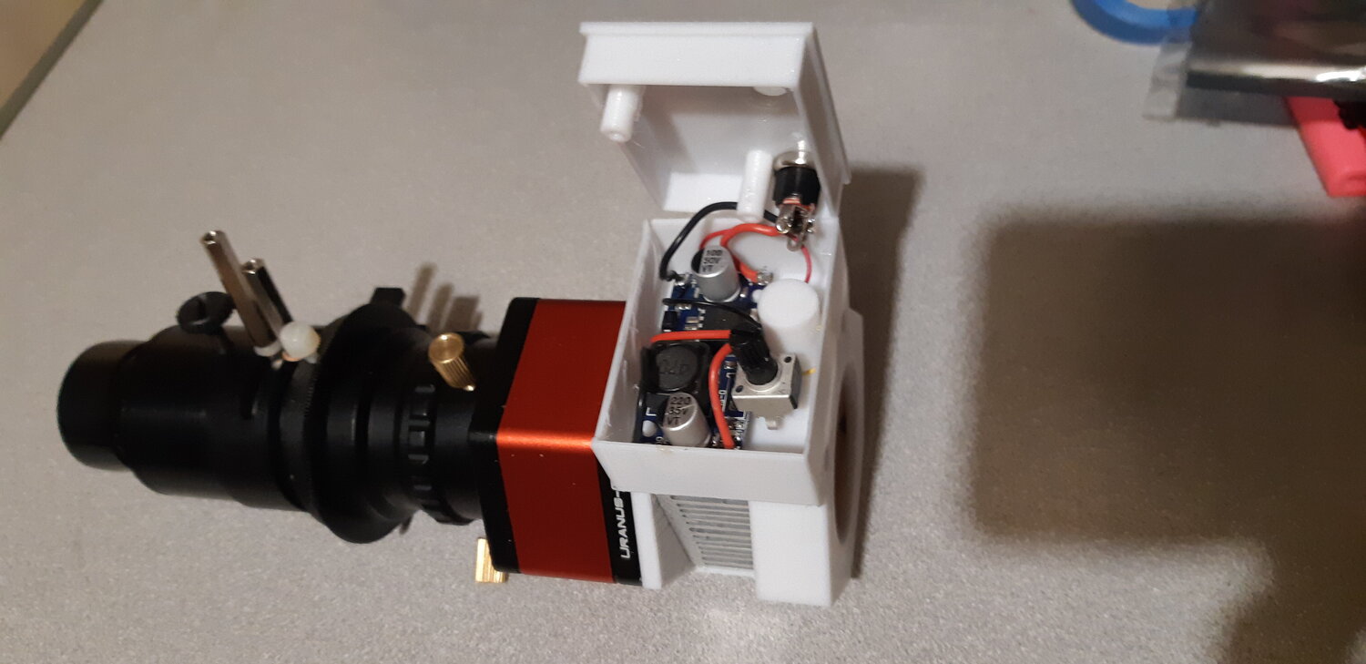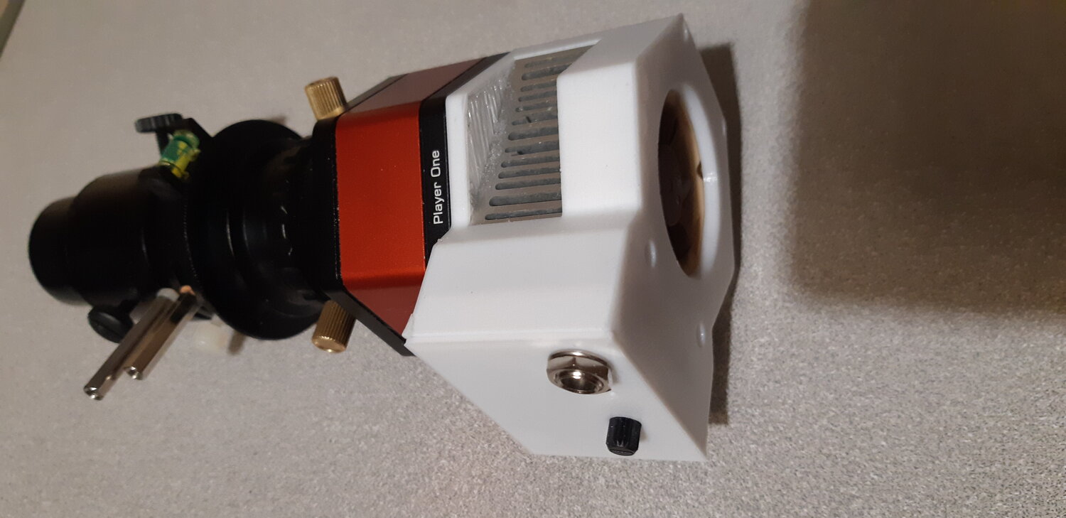 Bonjour à tous, Je vois qu'il y a eu pas mal de posts depuis mon sujet initial ! C'est cool ! Bref cela m'a donné des idées et voici donc l'upgrade Peltier de mon système ACS. Un Peltier 30x30 x3.6mm et un dissipateur 40x40x20mm de récupération, un ventilateur ultra silencieux Noctua de 40mm et un petit module d'alim variable basé sur le LM2596 trouvé sur Amazon, Un peu de FreeCad et quelques heures d'impression et me voilà prêt à faire des tests. Voici les résultats: Je ne suis pas monté beaucoup lus de 7V car après l'intensité monte vite car le peltier n'est plus assez refroidi par le dissipateur qui commence à chauffer lui aussi. (1.2A à 8V). Le rendement n'est alors plus très bon et le surplus d'énergie à dépenser pour seulement quelques degrés de moins n'en vaut pas la peine à mon sens. Cela reste du bricolage 🙂, on ne va pas trop lui en demander. Surtout après, plus froid, cela entraine d'autre contraintes qui vont complexifier le dispositif, comme une régulation en température, une résistance chauffante pour la buée... Maintenant le résultat en graphique: On arrive en consommant moins de un Ampère à un delta de température de -20°C car sans système de refroidissement la caméra monte à plus de 32°C à 1/1000s (179FPS lors des tests) et à 29°C pour les pauses de 5 min. C'est donc une belle performance ! 😉 Si on se réfère aux données constructeur, le courant de dark est alors divisé par 10, soit 0.02 e-/s/Pix ! Et cela laisse rêveur quand on voit le courant de dark de l'Ares-M (IMX533) dans les mêmes conditions : 0.0025 e-/s/Pix 🫠