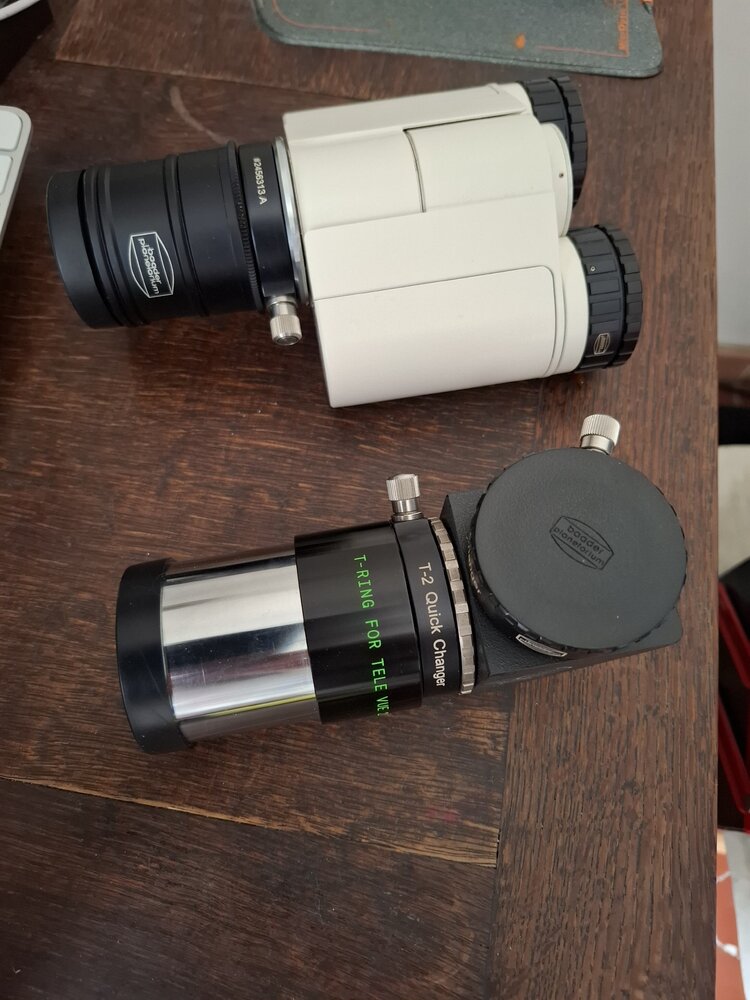 Bonjour, Si ça peut t’aider je t’envoie une photo de mes différents montages.J’utilise la bague T-2 quick changer pour raccorder mes accessoires.Quand j’utilise la tête bino sur mon dobson je dévisse légèrement la vis de la bague pour faire tourner la tête bino. Bon ciel -