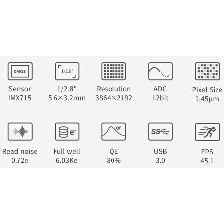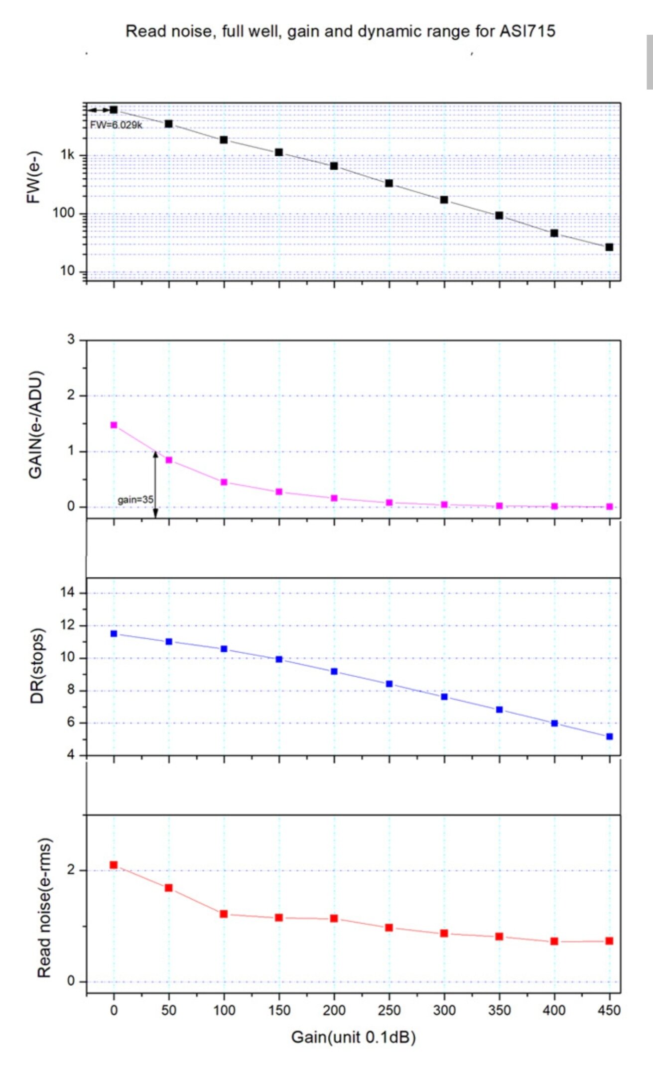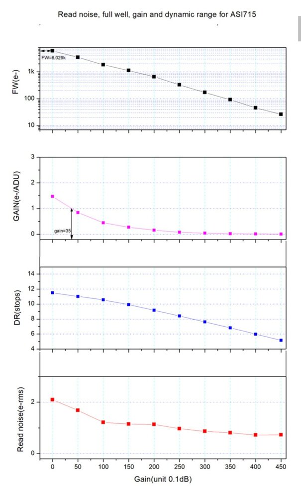 Bonjour, j'ai besoin de vos avis d'expert pour le choix de ma futur vrai camera d'astronomie planetaire. J'ai un dob 254/1200 et donc comme dit dans le titre, j'hésite entre la 662 et 715. En prenant en compte le pouvoir séparateur de mon téléscope qui est egal à 0.47sec/arc, j'ai besoin d'un échantillonnage à 0.23, avec la 662 et ses pixels de 2.9, je tombe à 0.49, j'aurai donc besoin d'une barlow x2 mais perdrais donc 4x plus de lumière que si elle était au foyer. C'est a ce moment que la 715 rentre en jeu, avec ses pixels à 1.45, j'ai 0.245 d'échantillonnage et donc pouvant la mettre directement au foyer j'ai le maximum de luminosité ainsi que aucun risque d'aberation chromatique ajouté par la barlow. Avantage pour la 715 donc. Ensuite vient toutes les autres caractéristiques : Voir les images jointes. Donc on voit que la 662 a un meilleur QE, FULL WELL et FPS que la 715 Mais dans le cas du fps on peu faire du ROI sur les deux caméra, juste il y aura un palier avec la 662 à cause de la barlow et sa baisse de luminosité. Je donne donc un légé avantage pour la 715, meme si de base elle a un assez faible fps (45) en full capteur. Puis ensuite le QE et le full well il faut plutôt lire les graphiques, pour connaître ou ces caméra sont sensé etre utilisé. Voir photo. Bon donc maintenant on lit que : La 662 a 250gain = fw 2500, adu 0.5, 11 stop et noise de 1 La 715 a 50gain = fw3500, adu 0.8, 11stop et noise de 1.6 La 715 a 100gain = fw2000, adu 0.5, 10.5stop et noise de 1.2 L'avantage du full well de la 662 n'est plus la. Puis il reste le QE, mais bon je crois que ca suffit. Donc avec tout ce que j'ai cité je suppose que vous allez me dire que je devrais partir sur la 715. Bon j'ai pas vraiment posé de questions, j'ai plutôt cité ce que j'avais compris. J'aimerais que vous m'aiguiller et que vous me reprenez si je me suis trompé. Juste une vrai question : dois-je je ajouter un filtre ir-cut ? Merci beaucoup.