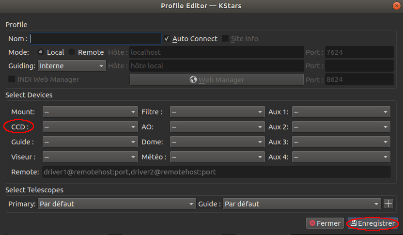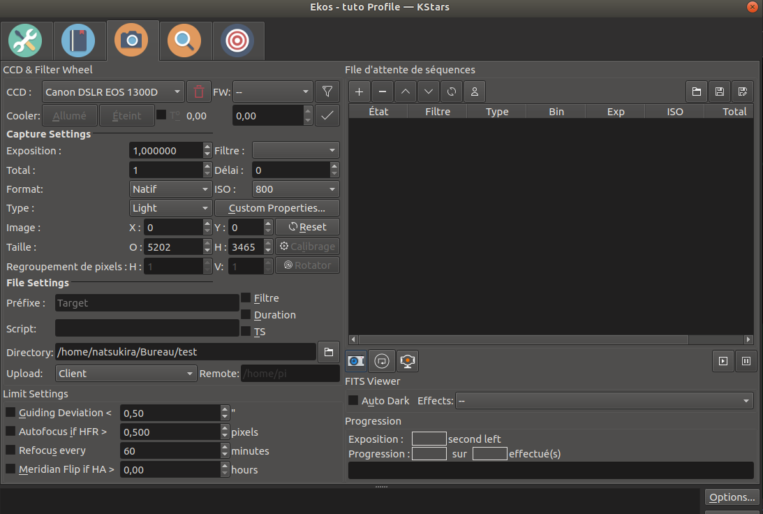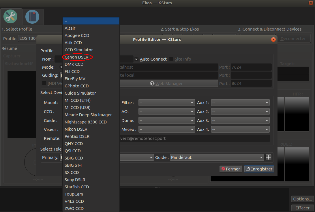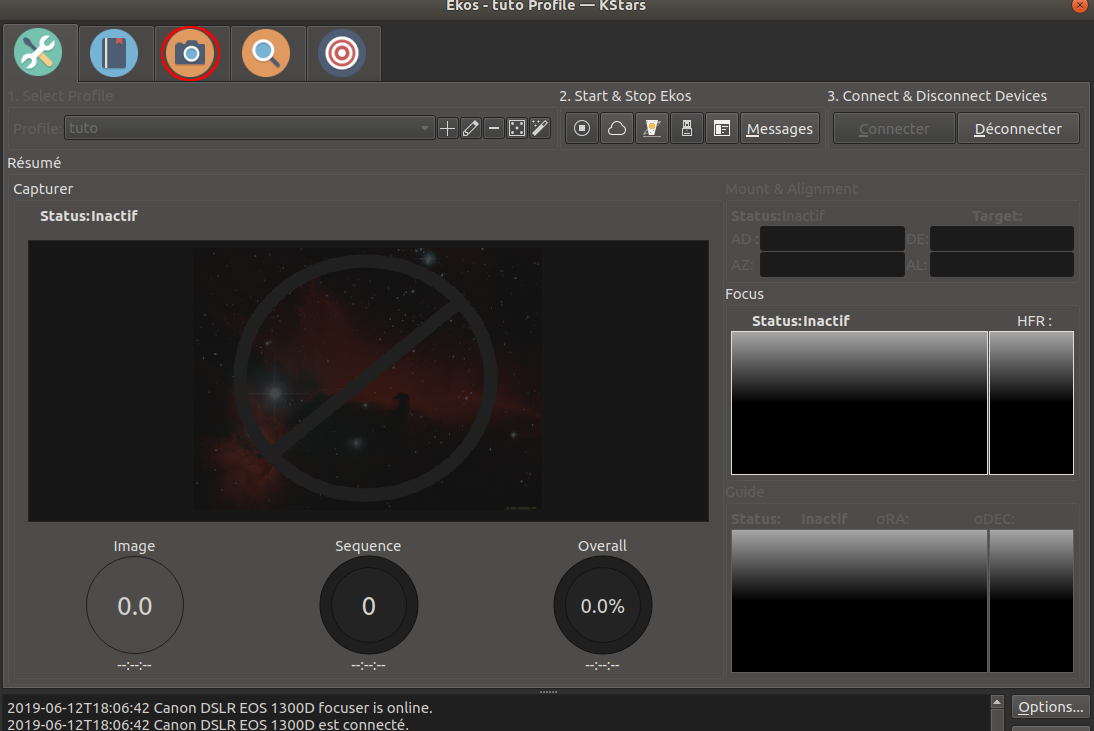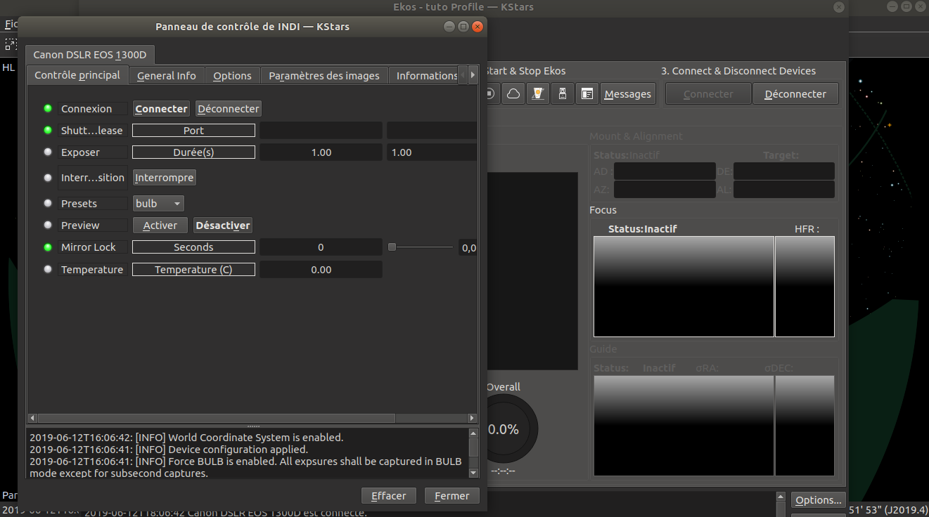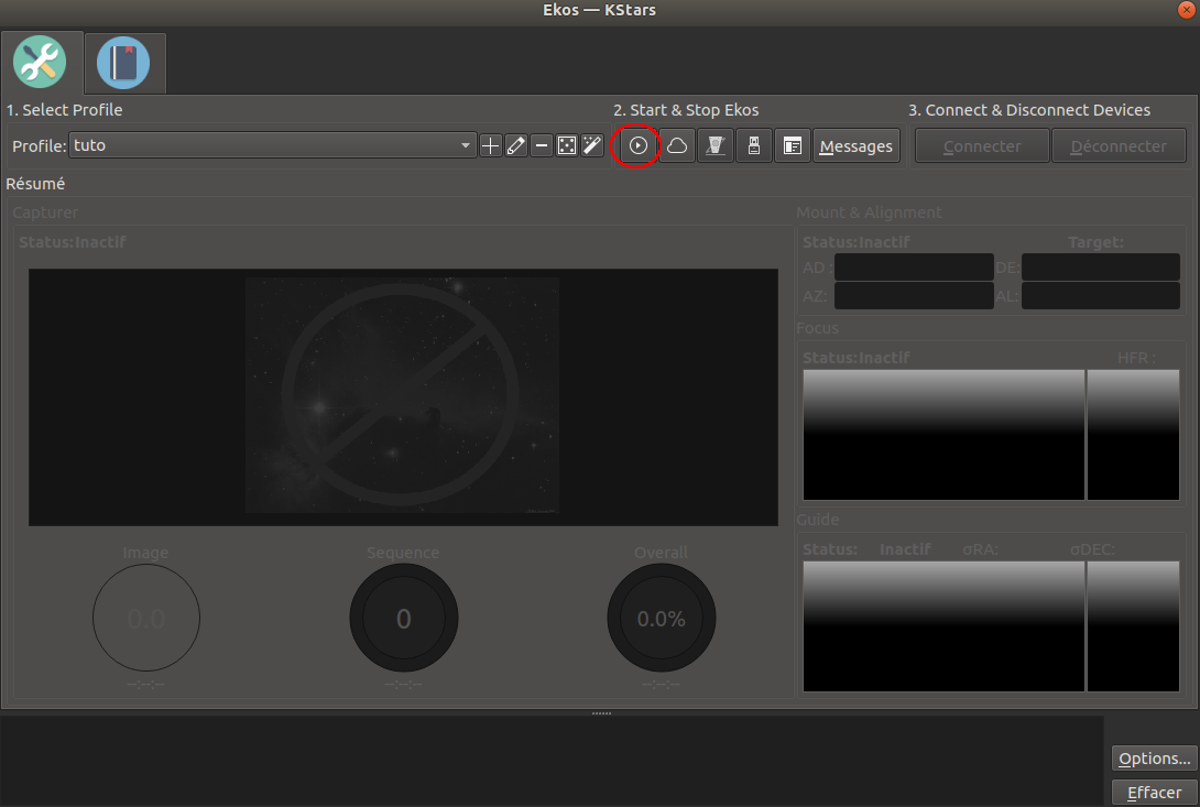 Vous pouvez fermer cette première fenêtre, revenons sur Ekos.