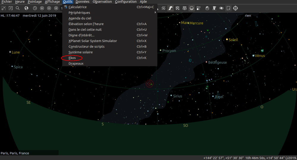 Si c'est le cas, ouvrez le menu outil en haut à gauche, puis séléctionnez "Ekos" :