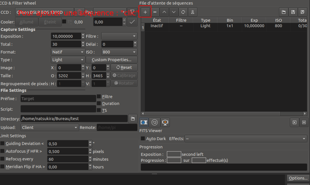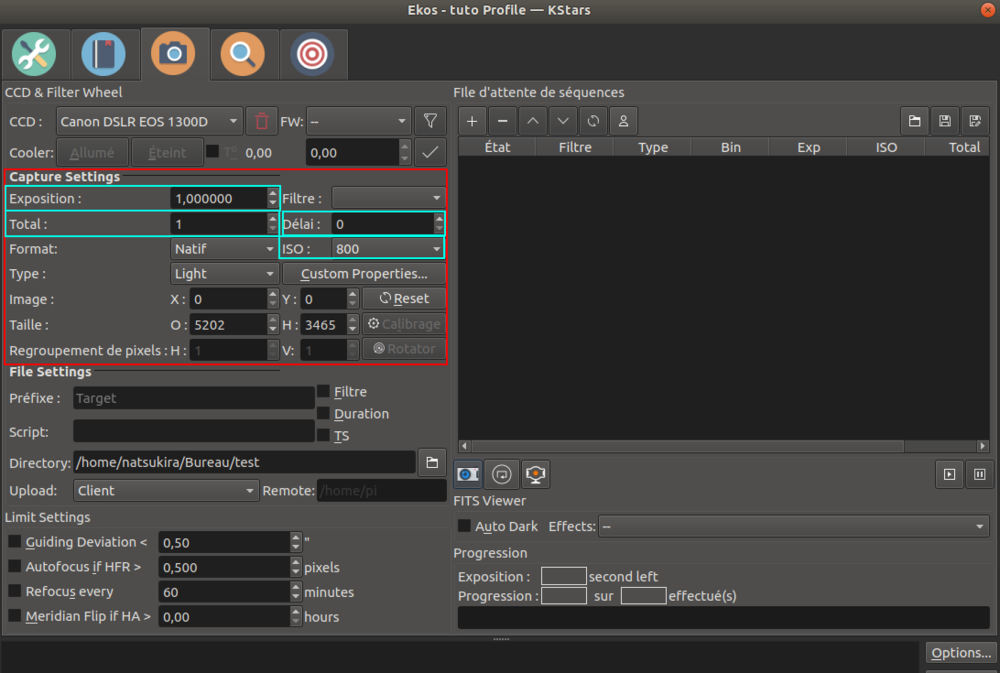 Par là, ce sont tout les paramètres d'expositions, d'iso, le délai entre chaque pose, le total de poses et le format ( FITS ou RAW ) :