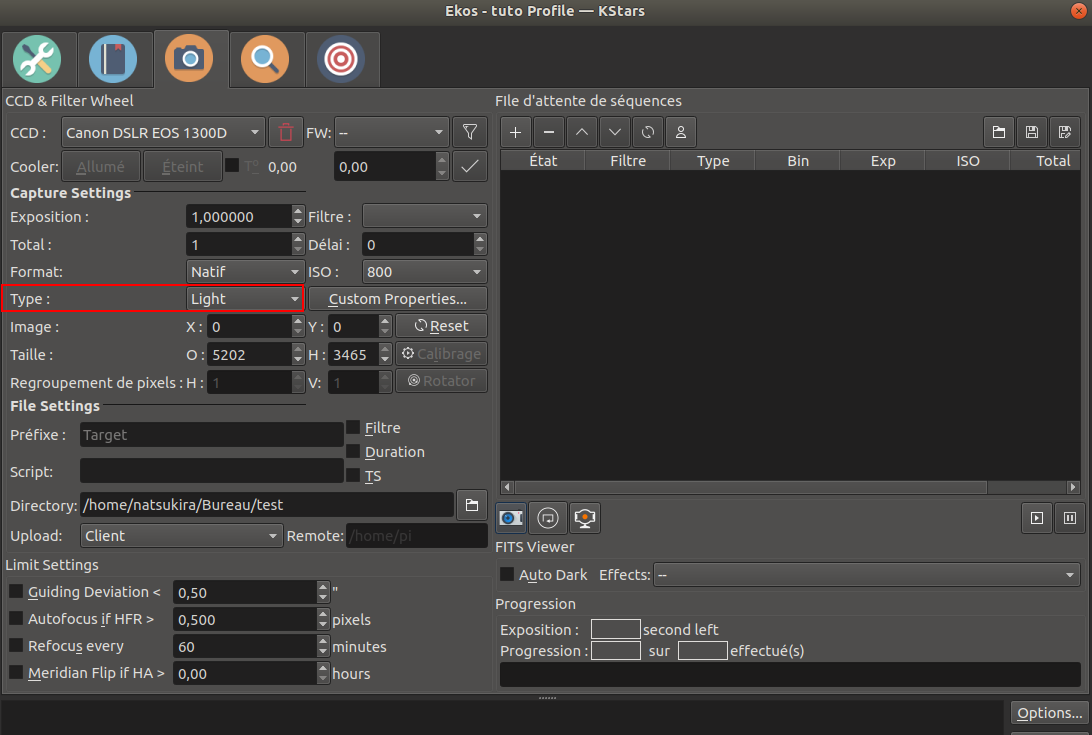 Avant dernier point, pour changer le type de prise, "Light, Dark, Flat, ou Offsets" il faut cliquer ici :