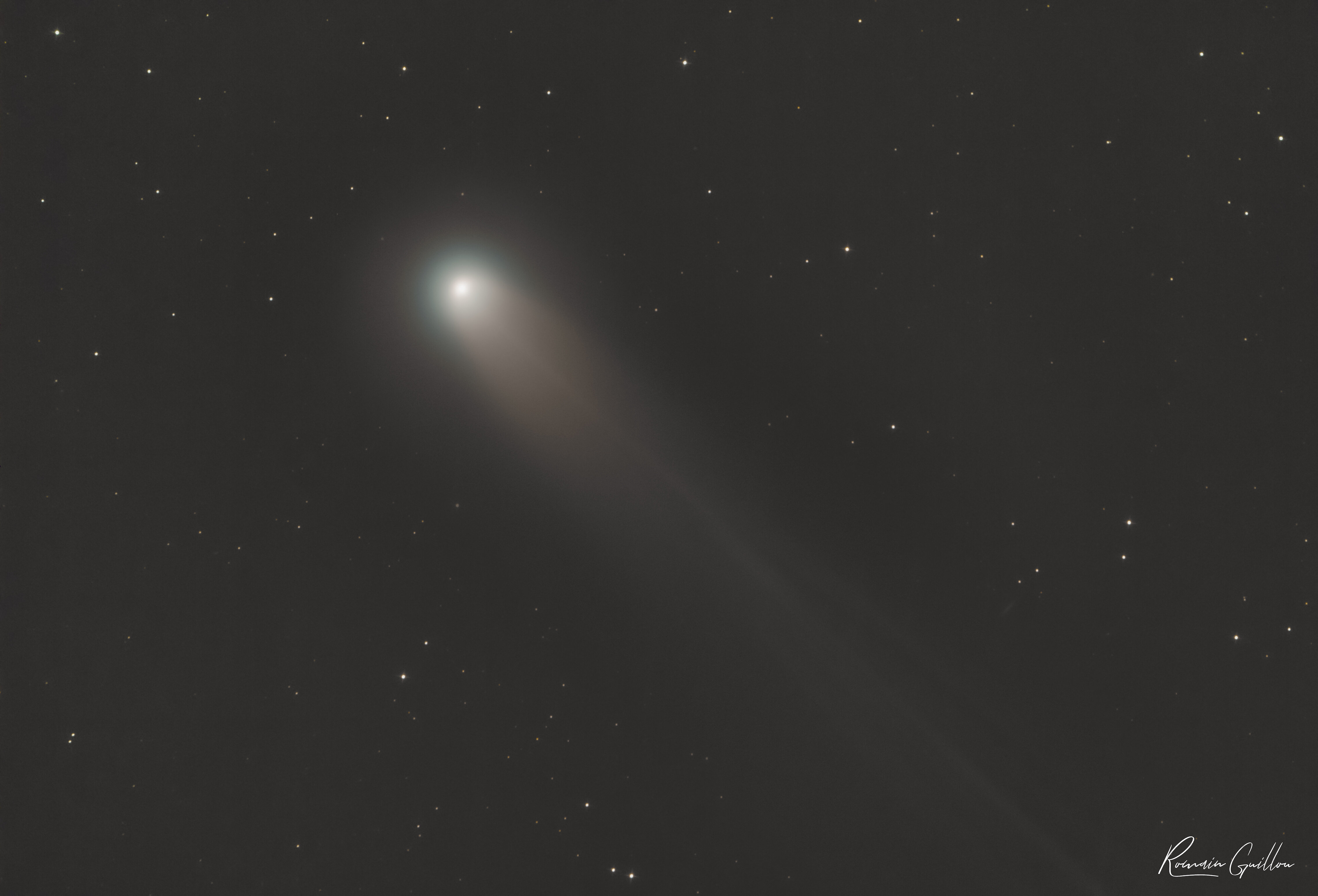 Voici la comète C/2025 A6 - Lemmon, Prise ce matin le 11/10/25 (de 5h00 à 6h00) dans la constellation de la Grande Ourse. - Charente, depuis mon jardin Je sais pas vraiment traité les comètes.. ça bouge trop et c'est super difficile d'avoir le fond du ciel et la comète bien net.... je suis preneur pour voir des tuto sous siril car j'avoue que j'ai fait ça un peu à l'inspiration 😂 Exifs : 40x60s à 800iso Canon 60D défiltré partiellement. DOF Autoguidage - lunette 60D SW Quattro 250P EQ6 r Pro Asair Plus