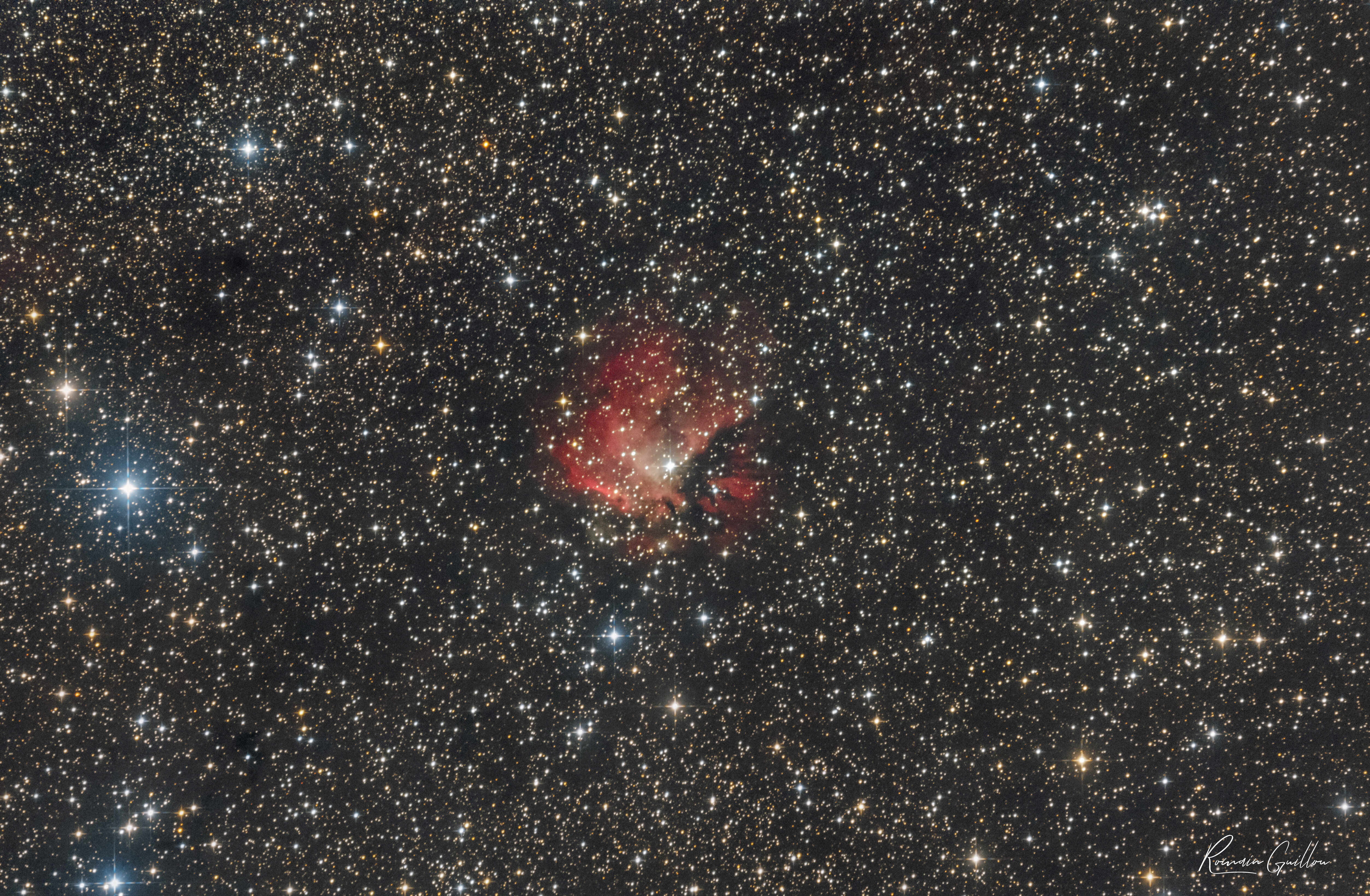 Sh2-108 – Région de Sadr (γ Cygni) Image réalisée hier soir autour de Sadr (Gamma Cygni), l’étoile supergéante jaune-blanche située au cœur de la constellation du Cygne. Cette zone du ciel, riche en hydrogène ionisé et en poussières, abrite la nébuleuse Sh2-108, souvent désignée comme la région de Sadr. On y distingue de nombreuses zones d’émission rougeâtre (Hα) entremêlées de bandes sombres de poussière. L’ensemble forme un champ complexe, typique du plan galactique, où les nébuleuses d’émission, de réflexion et les nuages obscurs se superposent. Malgré la forte luminosité de Sadr, le traitement permet de faire ressortir les structures diffuses environnantes sans saturer le cœur de l’étoile. En bas à gauche du champ se trouve NGC 6910, un petit amas ouvert d’étoiles jeunes. Exifs : 101x120s à 800 iso Canon 60D défiltré LPF-1 mod Télescope : SW Quattro 250P 250/1000 Monture : SW Eq6 r Pro Autoguidage lunette 60mm ZWO mini DOF : 30x30x30 Pilotage : Asiair Plus 256go Prétraitement Siril + Traitement : LR