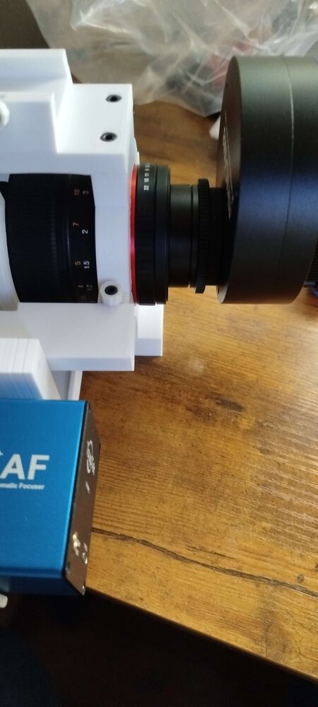 salut perso j'ai remplacé la baïonnette canon par un adaptateur en M48 comme ça je peux avoir un train d'imagerie un peu plus long avec l'avantage d'un montage 100% vissé du coup mon montage est le suivant adaptateur qui remplace la baïonnette canon <> spacer M48 <> adaptateur M48 vers M42 <> adaptateur M42 vers monture C <> QHYCCD minicam8 baïonnette M48 https://www.firstlightoptics.com/adapters/astro-essentials-samyang-lens-to-m48-adapter.html on la trouve sans doute aussi sur aliexpress faut juste faire attention à ce quelle soit compatible pour les spacer et adaptateurs on les trouves pas cher sur aliexpress (je n'ai rien contre les boutiques françaises, mais 20 balles le spacer c'est un peu du foutage de gueule) cdt