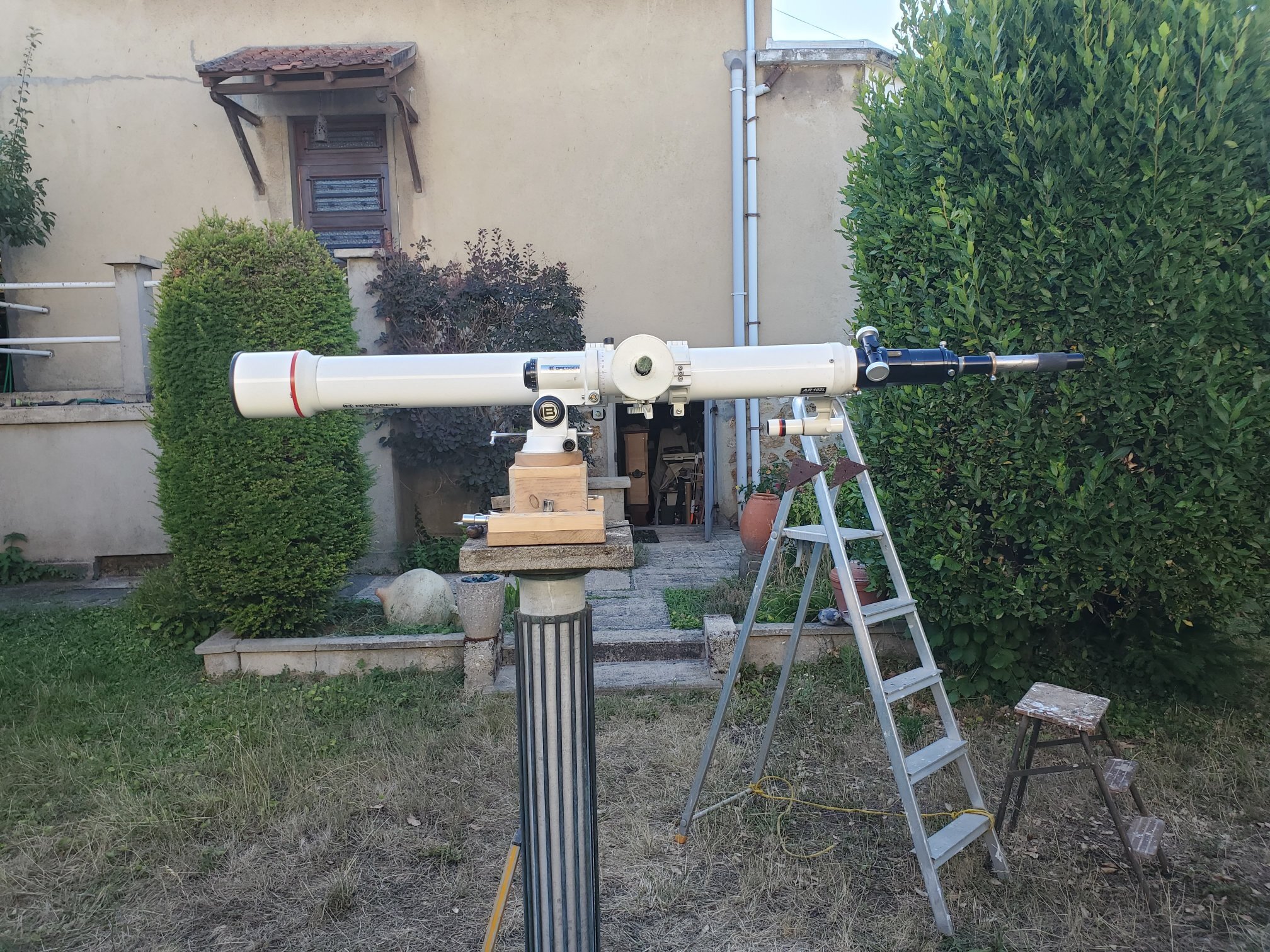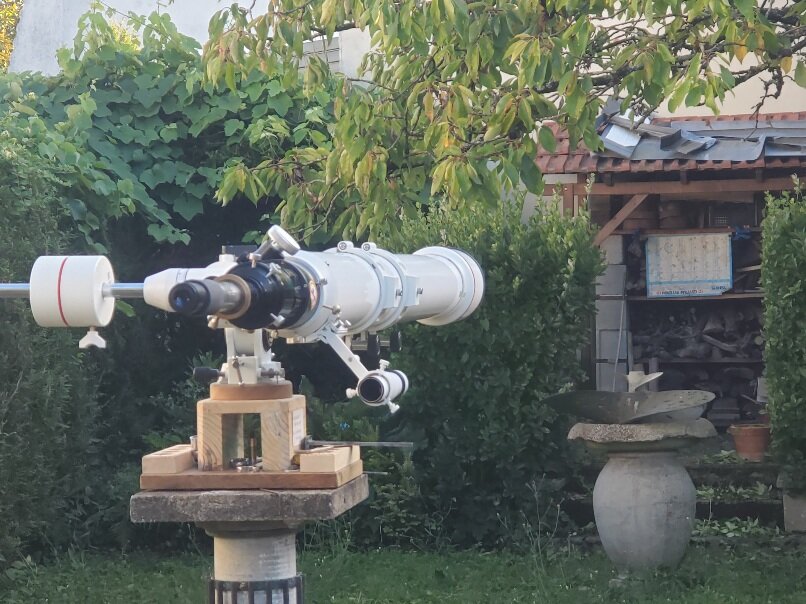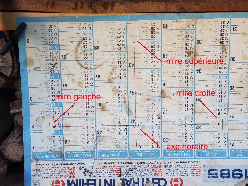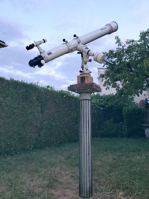 bonjour les amis depuis un moment je suis obsédé par la mise en station de ma brave monture équatoriale bresser eq4 pour lunettes lunette bresser ar102 L / 1350 à queue d'aronde vixen monture équatoriale sur poteau fixe je suis passé à l'acte avec la méthode suivante que je vous fais partager lunette équipée de l'oculaire réticulé de son chercheur il faut une cible comprenant un axe horizontal (vérifié au niveau à bulle) et 4 mires axe horaire, droite, gauche et supérieure la distance des 3 dernières à la première est égale à la distance entre l'axe horaire et l'axe optique de la lunette lorsqu'ils sont parallèles 1/ réglage du parallélisme axe horaire (AH) / axe optique lunette (AO) <<<<< loin d'être garanti par construction AH à l'horizontale ((à l'oeil) l'escabeau ne tient pas la lunette ! lunette à la verticale de l'AH et parallèle à celui-ci (à l'oeil) niveau à bulle posé sur la génératrice supérieure du tube (réputé parallèle à l'AO de la lunette) ajustement de l'inclinaison AH pour centrer la bulle ->>>> combine : faire pivoter le niveau de 180 °horizontalement pour pallier un éventuel défaut de la bulle visée sur sur la cible et positionnement vertical de celle-ci pour que la mire supérieure soit à la hauteur du réticule basculement de la lunette de 90 ° à droite niveau à bulle posé sur la génératrice supérieure du tube bulle centrée visée sur sur la cible et positionnement horizontal de celle-ci pour que la mire droite soit centrée sur le fil vertical du réticule basculement de la lunette à gauche niveau à bulle posé sur la génératrice supérieure du tube bulle centrée visée sur sur la cible, si c'est bien réglé la mire gauche doit être centrée sur le fil vertical du réticule, refaire la manip complète pour affiner le résultat, faire des marques sur les limbes pour retrouver les positions axes parallèles fin de l'opération sinon ça veut dire que la lunette a du strabisme entre droite et gauche cad que son AO n'est pas parallèle à l'AH , déplacer la cible horizontalement pour répartir équitablement l'écart à droite et à gauche ce qui revient à aligner l'AH et sa mire (mais on le le voit pas) il faut ensuite modifier la direction de l'AO, sur ma monture c'est prévu avec 2 jeux de vis tirantes poussantes donc modifier jusqu'à ce que le résultat soit bon, refaire la manip complète pour affiner le résultat, fin de l'opération à noter que heureusement la dépose repose de la lunette sur la monture ne détruit pas le réglage. on a donc maintenant un superbe instrument avec la lunette qui va remplacer avantageusement et gratuitement un viseur d'AH 2/ alignement de la monture - inclinaison latitudinesque de l'AH lunette à la verticale de l'AH (en se servant des marques faites précédemment) viser le pole céleste (qu'on peut extrapoler avec une carte stellaire) ou une étoile voisine à sa digression ajuster la latitude pour faire coïncider avec le fil horizontal du réticule 3/ alignement de la monture - en azimut sur le méridien local lunette à 90° de la verticale de l'AH (en se servant des marques faites précédemment) ajuster l'azimut pour qu'une étoile voisine de l'équateur céleste coïncide avec le fil vertical du réticule à son passage au méridien (s'aider de stellarium) j'ai fais tout ça et ça suit bien les astres sur plusieurs heures et mon esprit va pouvoir se reposer