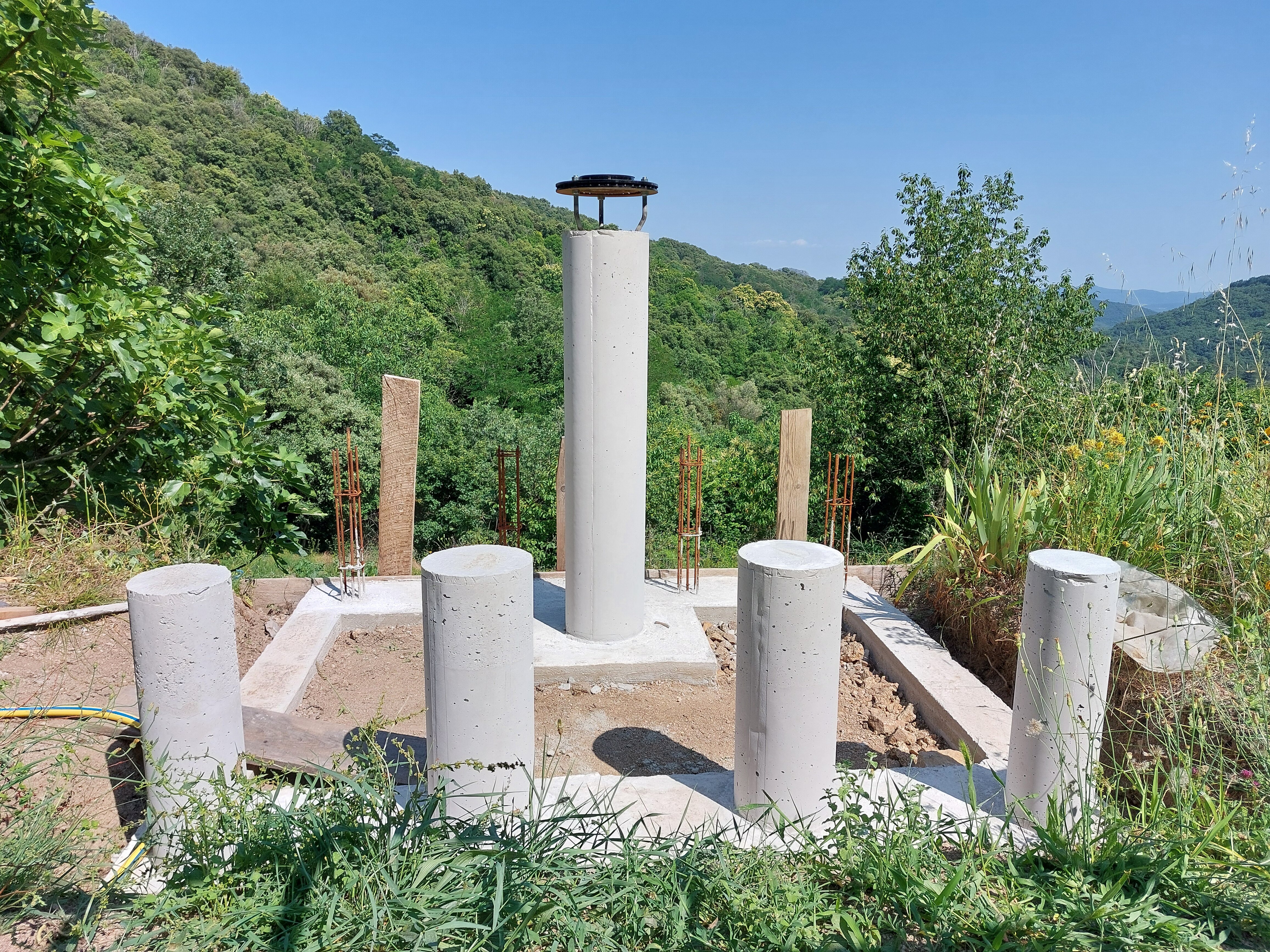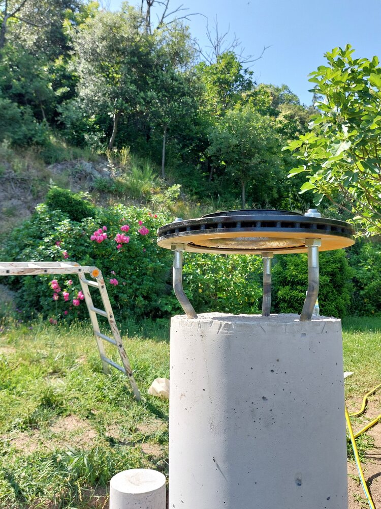 Quand ce sera terminé je verrais en fonction des arbres et des montagnes si je peux gagner en angle en augmentant la colonne qu'il faudra que je casse pour sortir les pieds support de disque. (colonne de 300mm, 200mm à casser plus 200 de rehausse ça fait quand même plus d'un seau mais deux sac et demi de 25kg de béton prêt à l'emploi mais c'est faisable ) -